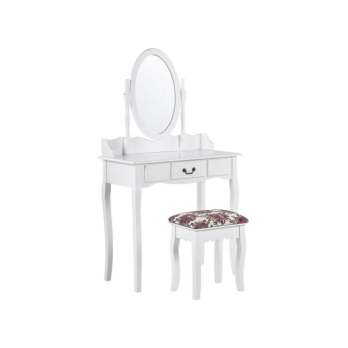 This dressing table will surely find its way to any retro-styled bedroom. Enjoy your toilette sitting on the comfortable stool which is included in the set. The table is equipped both in a drawer and an adjustable mirror, which position can be changed horizontally. The whole set is manufactured from solid MDF, giving off sleek and simple design which is complemented by solid wood, cabriole legs.