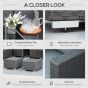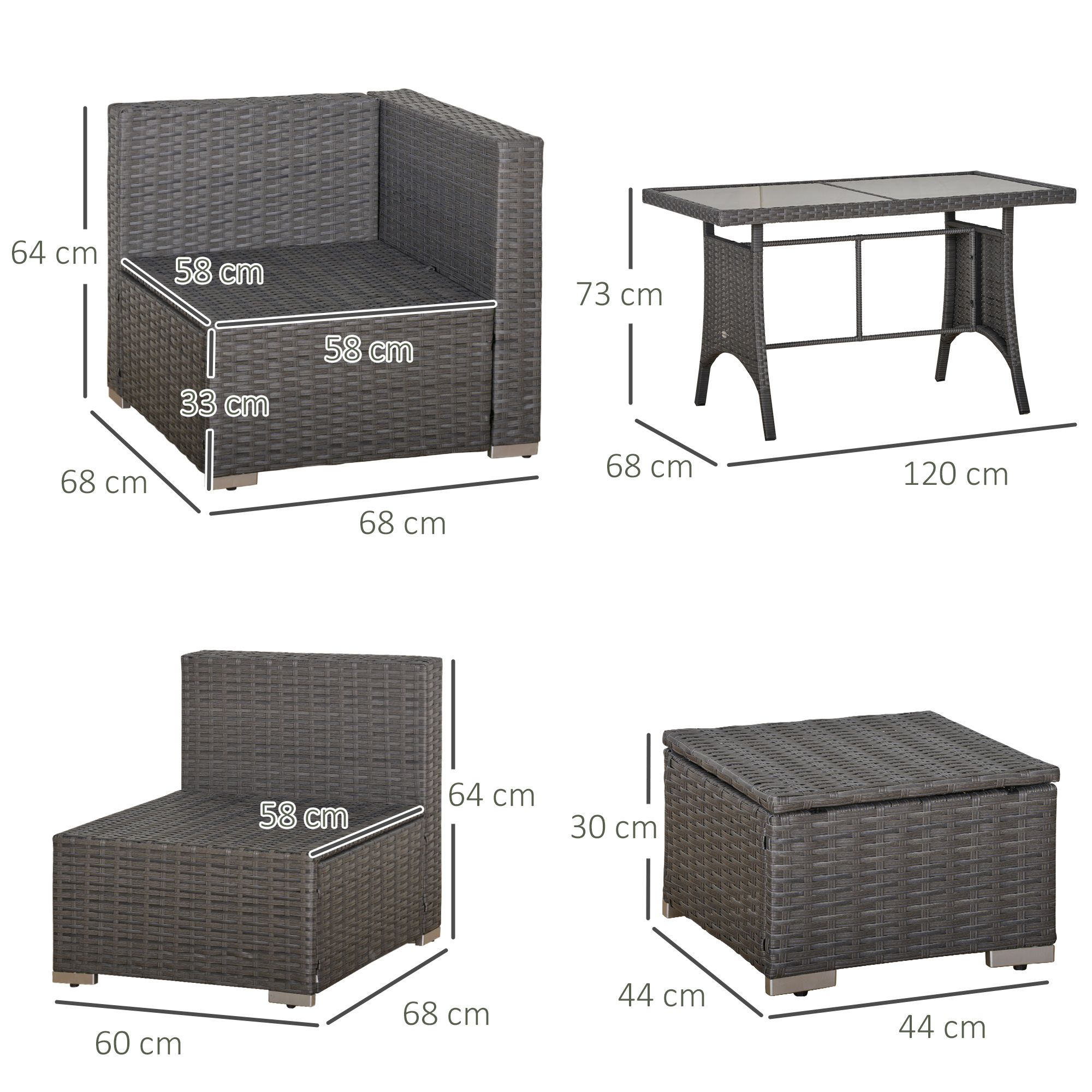 - Material: Steel frame, PE rattan, Polyester • Colour: Deep grey, Dusty blue cushion, Multi-colour throw pillow • Net Weight: 91.5kg • Table Dimension: 120L x 68W x 73H (cm) • Corner Sofa Dimension: 68W x 68D x 64H (cm) • Armless Sofa Dimension: 60W x 68D x 64H (cm) • Footrest Dimension: 44L x 44W x 30H (cm) • Table Max Load: 50kg • Single Sofa Max Load: 120kg • Footrest Max Load: 100kg • Seat Size: 58D x 33H (cm) • Backrest Size: 58W x 31H (cm) • Armrest Size: 10W x 64H (cm) • Sofa Seat Cushion: 58L x 58W x 10T (cm) • Back Cushion: 58L x 31W x 10T (cm) • Footrest Cushion: 40L x 40W x 10T (cm) • Throw Pillow: 40L x 40W (cm) • Tempered Glass Thickness: 0.5T (cm) • Custom Label: 860-014
