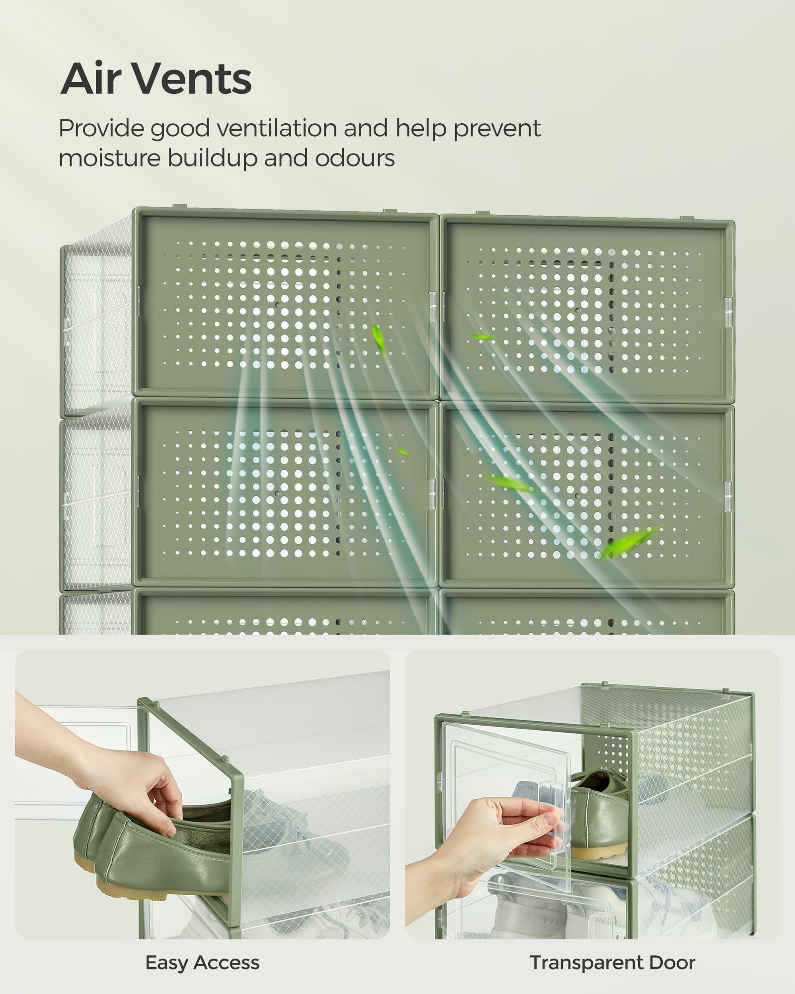 12-Pack Stackable Plastic Shoe Boxes Transparent and Laurel Green