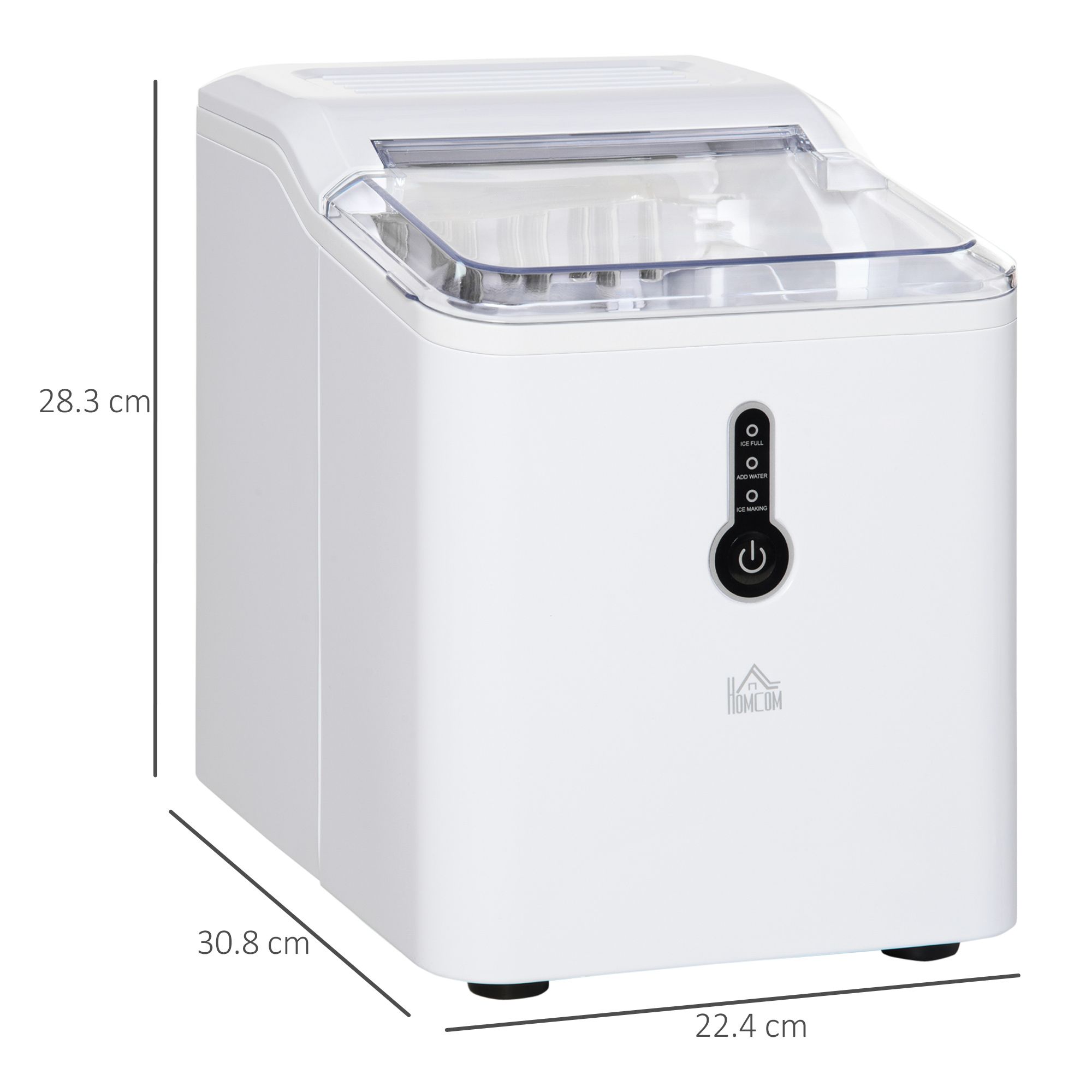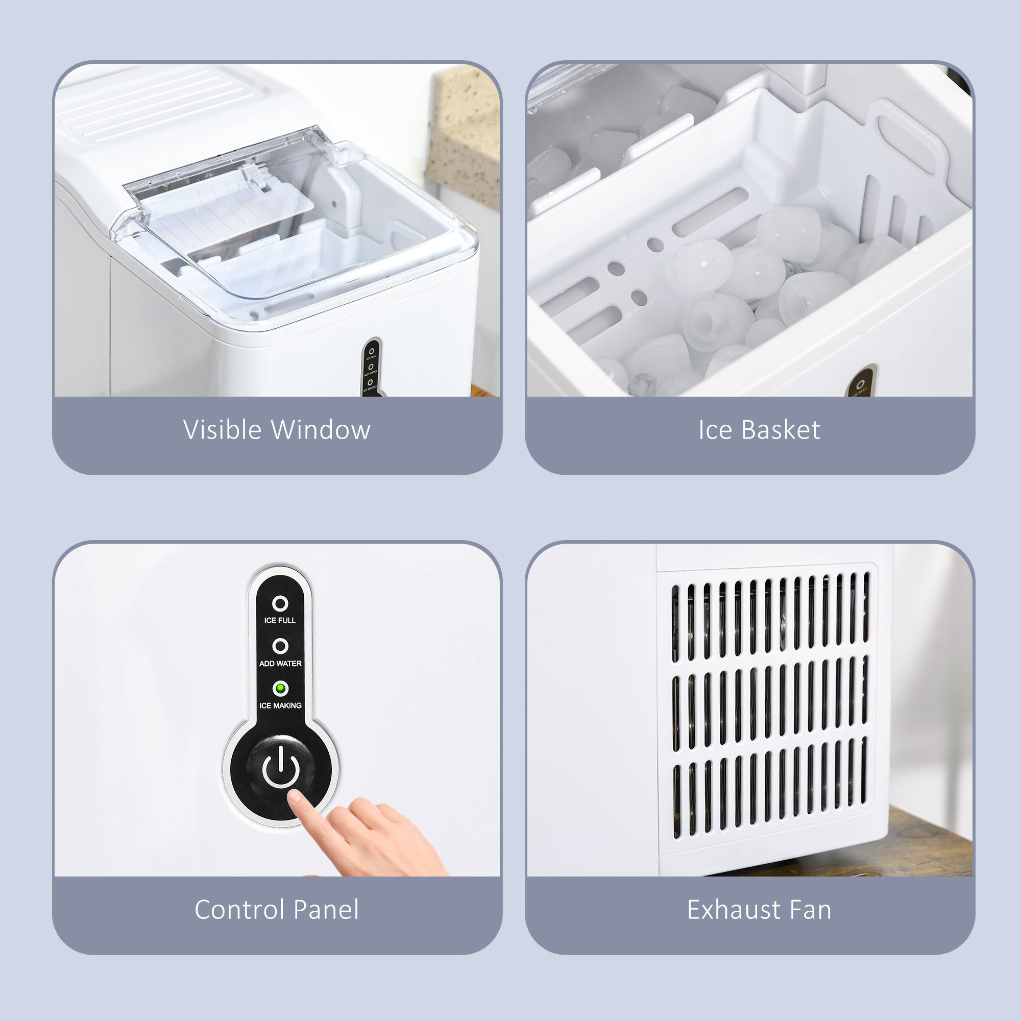 - Three on-machine indicators: 'ADD WATER', 'ICE MAKING' and 'ICE FULL' show you the status and next process step