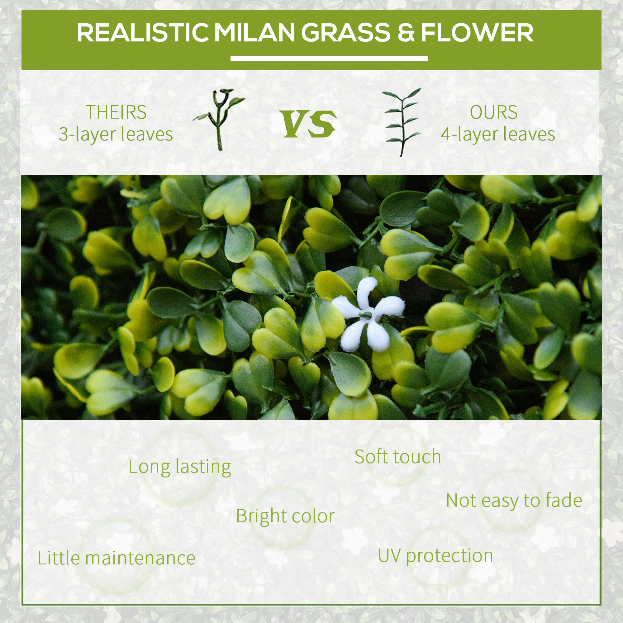 - LIFE-LIKE LOOK AND FEEL: Each fence panel with high density features 400 clusters of milan grass with flowers, making it ideal to beautify and transform your backyard, fence, patio, garden, yard, walkway, room, wall, interior or exterior. Our artificial boxwood hedges are often used as a decoration in weddings, restaurants, hotel lobbies, and more.