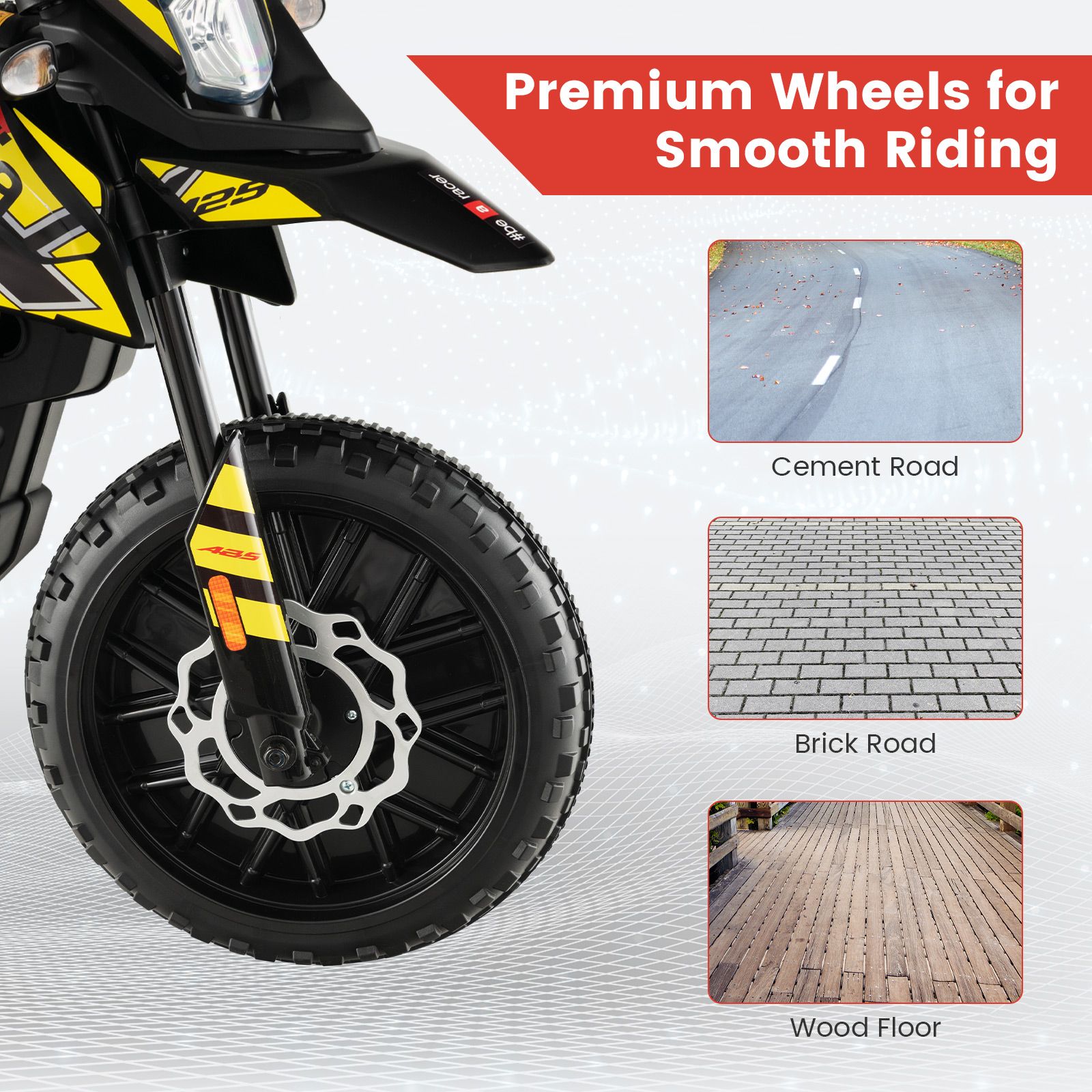 The 12V Aprilia licensed kids ride on motorcycle is a perfect choice for beginners to enjoy riding fun. Kids can operate the motorbike by pressing the start button and forward button. 2 motors allow kids to ride at 3.4-3.7 mph speed. When children are driving, the cool headlight and built-in music will bring them endless fun. 2 large wheels and 2 training wheels ensure a stable triangle structure for higher steadiness. The spring suspension ensures safe riding. It also has passed ASTM and CPSIA certifications for higher security. Furthermore, the extended seat and extra footrest also enable kids to ride comfortably. Cool and Fun Ride On Motorcycle: Cool mudguard, bright headlight and simulated exhaust pipe make this ride on toy look like a real motorcycle. Kids can press the power button and forward button to start or move it. Plus, there are different music to choose. It also has USB port and wireless function for more music options. Dual Motors for High Performance: Equipped with dual powerful motors, this Aprilia licensed motorcycle can reach 3.4-3.7 mph speed, offering your little one an exciting driving experience. Besides, powered by 12V 7AH battery, this motorbike ensures 1-2 hours play time. Safe and Smooth Riding Experience: 2 high-quality wheels with spring suspension enable kids to safely and smoothly ride on the wood floor, cement road or brick road. What's more, 2 training wheels make it anti-rollover and help to increase overall sturdiness. Durable Structure and Extended Seat: Thanks to its selected PP and metal material, this motorcycle will accompany your little one for a long time. Apart from that, the ergonomic seat fits well with kids' body curves, which adds their driving comfort. The comfortable footrest also offers a place for toddlers to relax their legs. Perfect Gift to Take an Adventure: This 12V Aprilia licensed motorbike is an ideal gift for kids' birthdays or other special days. Certified by ASTM and CPSIA, it's safe enough for kids from 3 to 8 years old to take an adventure. During riding, they can exercise fine motor skills and develop hand-feet coordination.