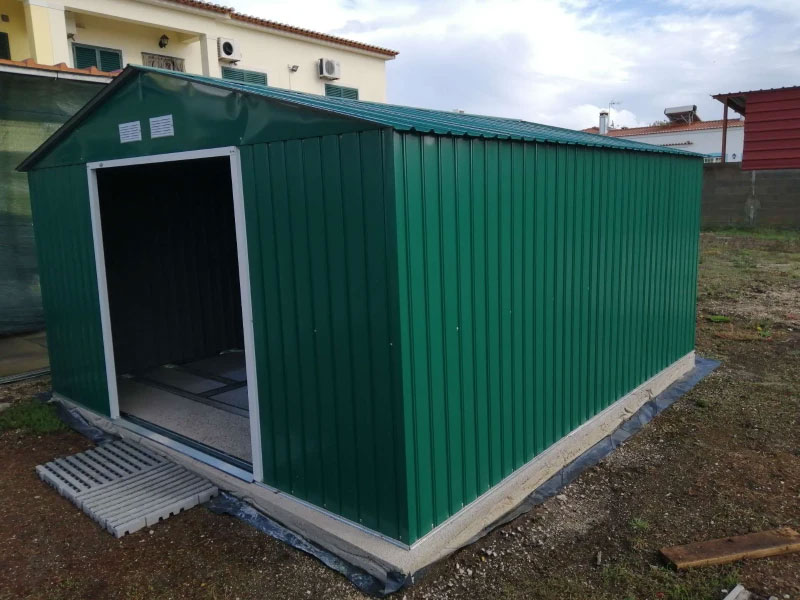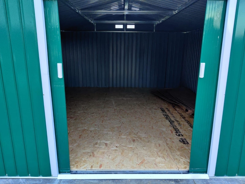 - SLOPED ROOF: Allows water to roll down to the ground, preventing build up, stagnation and rust damage. DOUBLE SLIDING DOORS: Allows easy access inside and keeps everything out of site from neighbours etc.