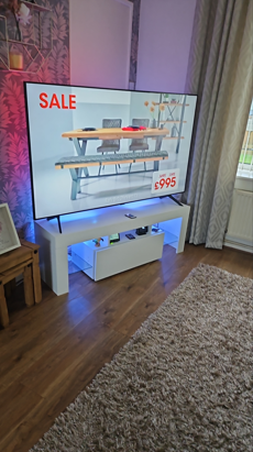 - STURDY STRUCTURE: Crafted of quality particle board, this white TV unit with LED lights is reliable and steady for your daily entertainments. In addition, the PVC foot pads enhanced the stability.