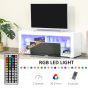 - DAZZLING LIGHTS: The glass shelves are equipped with RGB LED light. Just need to use the remote control, you can enjoy 20 colours of RGB lights, 2 lighting speeds: quick and slow, 6 lighting modes: auto, flash, fade3, fade7, jump3, jump7 and 6 DIY buttons for you to create the colours from this TV unit for 55 inch tv.