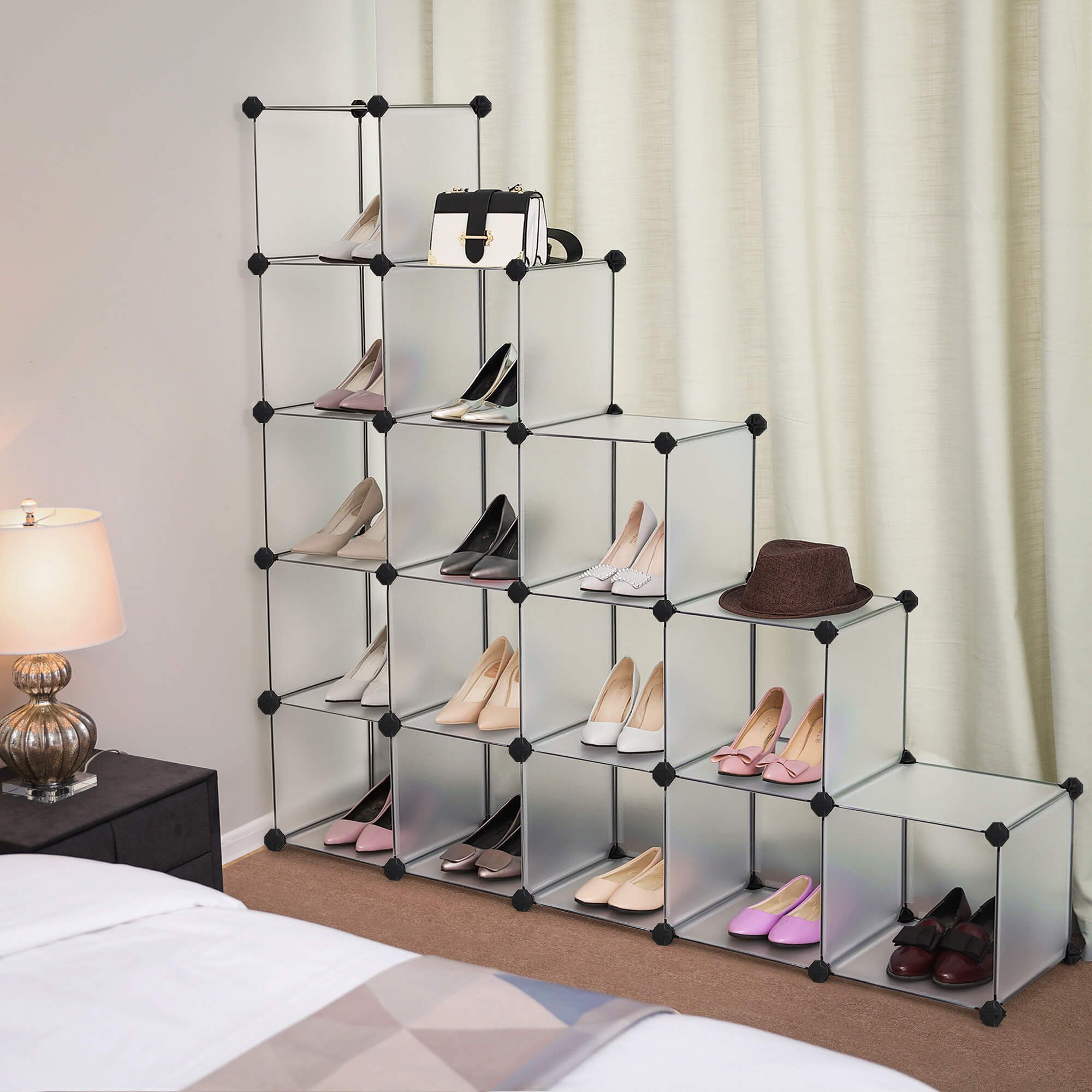 Maximize your shoe storage space with this versatile 16 Cubes Shoe Rack. With ample room to store your footwear, this rack features a sturdy construction and a sleek design. Its modular design allows you to customize the configuration to suit your needs, making it ideal for closets, entryways, or any room where you need to keep your shoes organized and accessible.