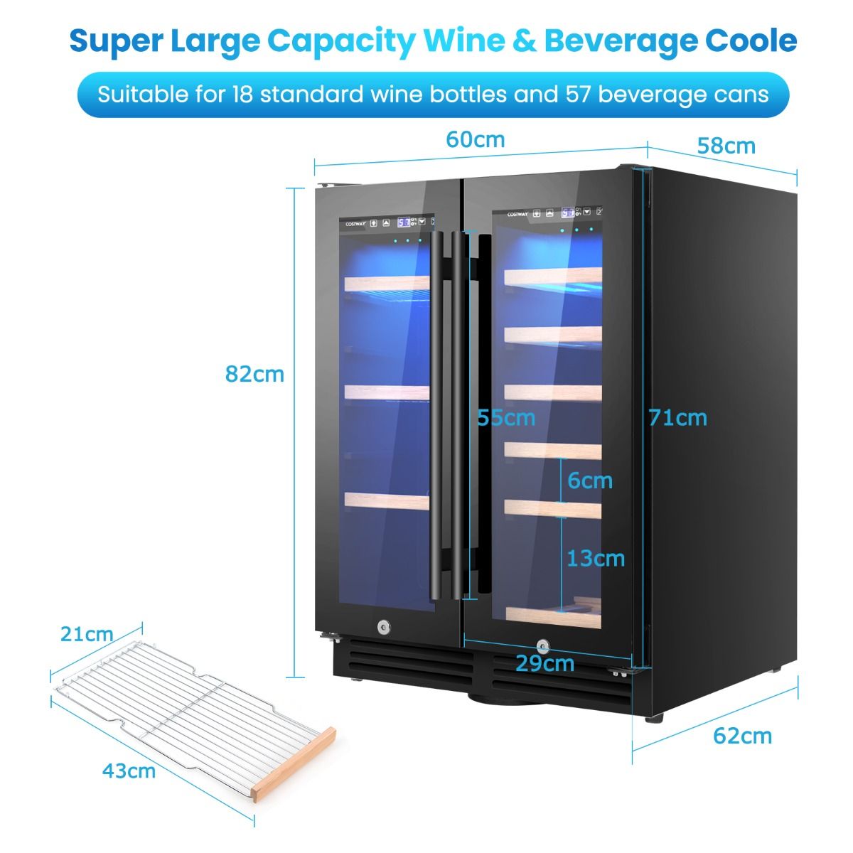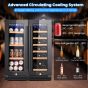 With high-quality circulating fan and quiet compressor, this cooler ensures a perfect storage condition. This beverage and wine cooler can hold up to 57 cans of beverage and 18 wine bottles at the same time. You can remove the beech wood and metal racks to adjust storage space. Besides, it also features carbon filter and automatic defrosting system. And it has 2 independent temperature zones for you to control the wine temperature from 5°C to 18°C and the beverage temperature from 2°C to 10°C. 2 Independent Cooling Zones: Thanks to the easy control panel, you can freely control temperature in 2 independent cooling zones: beverage refrigerator with 2°C - 10°C temperature range and wine refrigerator with 5°C - 18°C temperature range. You can also turn on/off interior LED lights and adjust its temperature display methods. Premium Circulating Cooling System: High-quality fan and low vibration compressor guarantee an advanced circulating cooling system, which helps to cool down your drinks and wines quickly. Besides, it’s also designed with carbon filter system and automatic defrosting function. Large Capacity Wine and Beverage Cooler: This large capacity cooler is able to hold 18 standard wine bottles and 57 beverage cans, which meets the needs of your whole family. Additionally, you can conveniently remove the beech wood or metal rack to fit beverages and wines of different heights. Dual-layer Tempered Glass Doors: We carefully design it with 2 dual-layer tempered glass doors to resist strong sunlight and isolate the outside air to better keep your drinks always in ideal temperature. Visible design and easy-to-grip handles also bring you much convenience. Safe and Durable Construction: Child safety lock and 2 keys avoid children’s access to wines. Adjustable legs help this 2-in-1 wine fridge cellar to stay stable on the floor. In addition, premium stainless steel material makes it strong and durable to ensure long-term use.