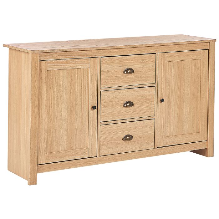 Beautiful sideboard in a timeless design that is sure to complement any home décor with its simple lines and warm tone of a wooden finish. Featuring two closed cabinets and three drawers, with lovely metal handles, it provides ample storage space. Thanks to its classic look, it will make a perfect addition to any living room or bedroom. Details: Color: Light Wood. Main material: Particle Board. Additional material: Metal. Weight: 50 Assembly: Full Assembly Required Legs Height: 9