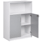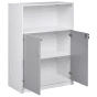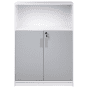 Unlock the gateway to organized brilliance with this office cabinet. The piece boasts a 2-door key-locked storage compartment with two shelves, ready to cradle all your documents in order and safety. Extra open shelf is perfect for storing trinkets and decorations. Elevate your workspace – where chaos meets its match, and innovation thrives. Details: Color: Grey, White. Main material: Particle Board. Additional material: Metal. Weight: 24 Assembly: Legs to be Fitted
