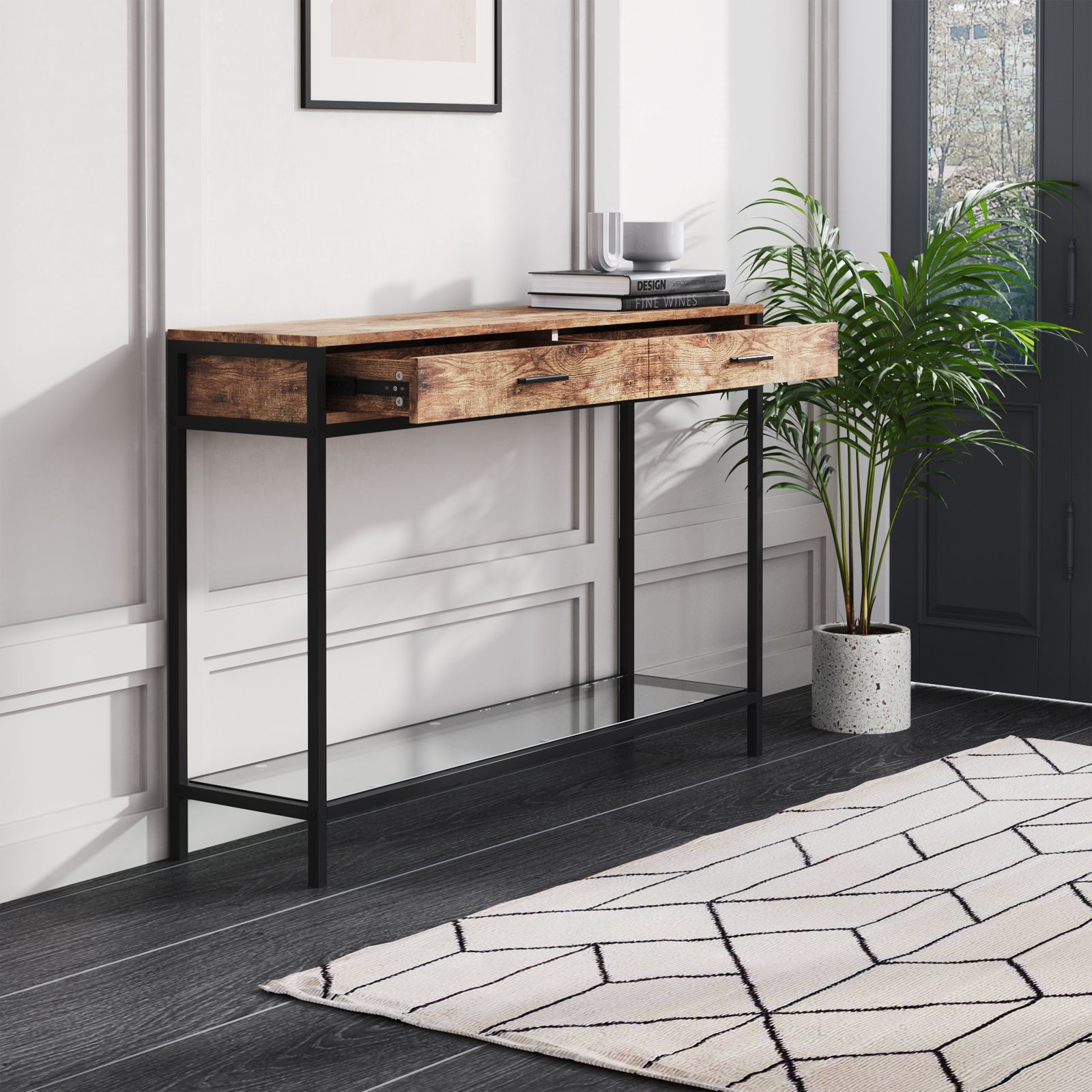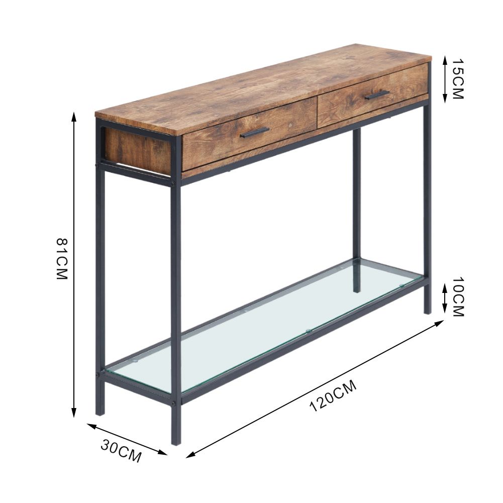 This 2 Drawers Console Table is perfect for adding a touch of style and storage to any room in your home. The table is made of wood and tempered glass, with a powder-coated metal frame, and features a wood table top and bottom glass shelf, as well as two drawers with retro handles.