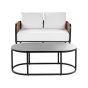 Elevate your garden's style and transform it into a meeting space with this furniture set. The sofa and table frames are made from durable, high-quality aluminium in a black finish, which makes them rust-resistant. What is more, the couch's backrest is adorned with attention-drawing Viennese braid, made out of PE rattan. The set also comes with thickly padded cushions in an off-white colour, crafted out of water-repellent fabric, which makes them perfect for outdoor use. The modern look of all pieces will allow you to match them with various contemporary outdoor spaces. Details: Color: White, Black. Main material: Aluminium. Additional material: Polyester, PE Rattan, Tempered Glass. Material Composition: 100% Polyester Weight: 39 Capacity: 2 People Assembly: Partial Assembly Required Weight Capacity: 260 Cushions Dimensions: 60x16x46 Legs Height: 20 Padding Thickness: 21 Seat Height: 41