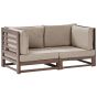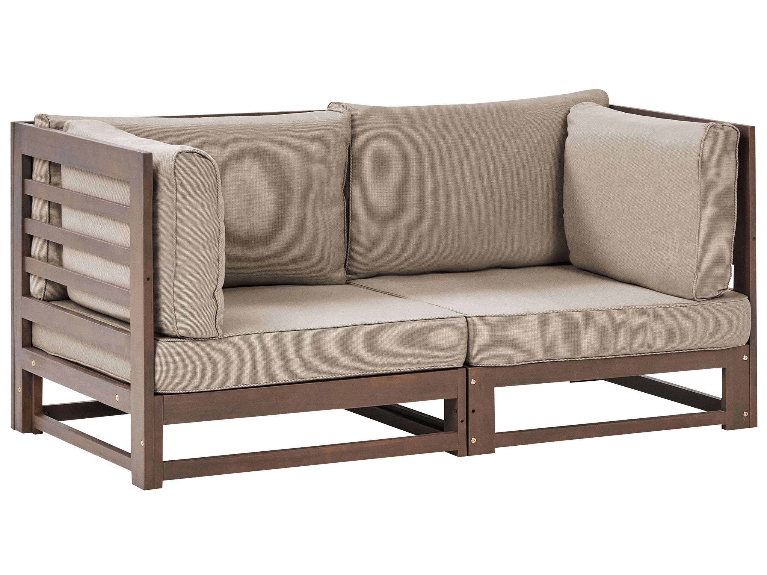 Bring comfort to your outdoor space with this 2-seater bench in a classic style. Crafted from certified acacia wood, it is furniture that will stay with you for years. The slatted backrest and armrests are a timeless feature that works well in any garden. For comfort, that bench comes with fitted cushions, also for sides, so that you can enjoy your outdoor time to the fullest. Details: Color: Dark Wood, Grey, Beige. Main material: FSC® Certified Acacia Wood. Additional material: Polyester. Material Composition: 100% Polyester Weight: 19 Capacity: 2 People Assembly: Full Assembly Required Wood type: Acacia mangium Wood Origin: Vietnam Weight Capacity: 320 Cushions Dimensions: 74x84x12 Legs Height: 20 Padding Thickness: 12 Seat Height: 32