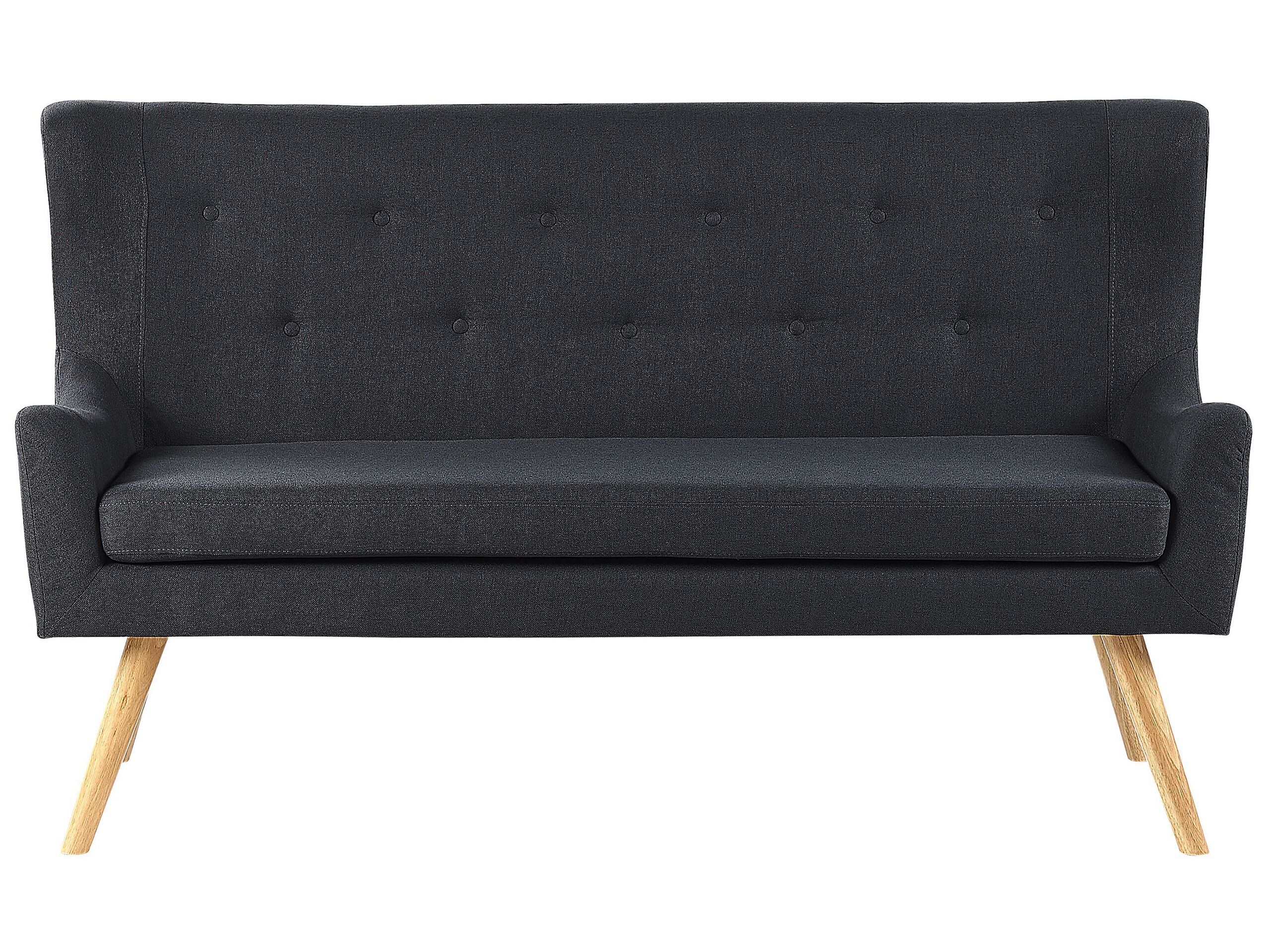Add a retro vibe to your kitchen and simultaneously gain a comfortable seat with this practical sofa. Its metal construction and wooden legs guarantee stability, while the easy-care polyester upholstery gives it a timeless look. The characteristic, winged backrest is decorated with a subtle, button tuft that perfectly complements the curved armrests. The piece splendidly blends in with modern and traditional interiors accentuating any space with the old-time charm. Details: Color: Black, Light Wood. Main material: Polyester. Additional material: Rubberwood, Eucalyptus Wood. Material Composition: 100% Polyester Weight: 28 Capacity: 2 People Assembly: Legs to be Fitted Wood type: Hevea brasiliensis, Eucalyptus grandis Wood Origin: China Legs Height: 32 Padding Thickness: 10 Seat Height: 51