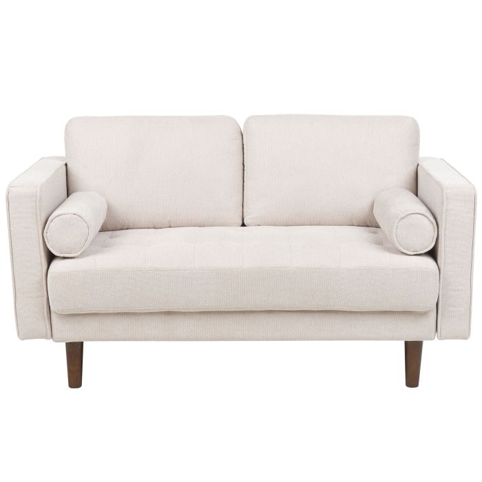 Revamp your living space with this timeless sofa featuring a retro vintage design, ideal for interiors with the same aesthetic. Upholstered from durable polyester, and supported by rubberwood legs, this piece not only exudes style but also promises longevity and sturdiness. The generously padded seat ensures both comfort and elegance. Complete the look by pairing it with matching furniture to create a stylish area. Details: Color: Beige, Dark Wood. Main material: Polyester. Additional material: Eucalyptus Wood, Rubberwood, Plywood. Material Composition: 100% Polyester Weight: 29 Capacity: 2 People Assembly: Legs to be Fitted Wood type: Eucalypteae Wood Origin: China Cushions Dimensions: 47x14 Padding Thickness: 19 Seat Height: 45