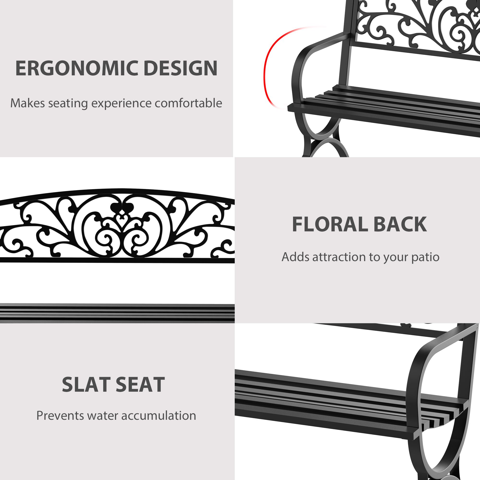 - Full-sized 127cm long garden bench with ergonomic curved seat design offers seating for two in comfort