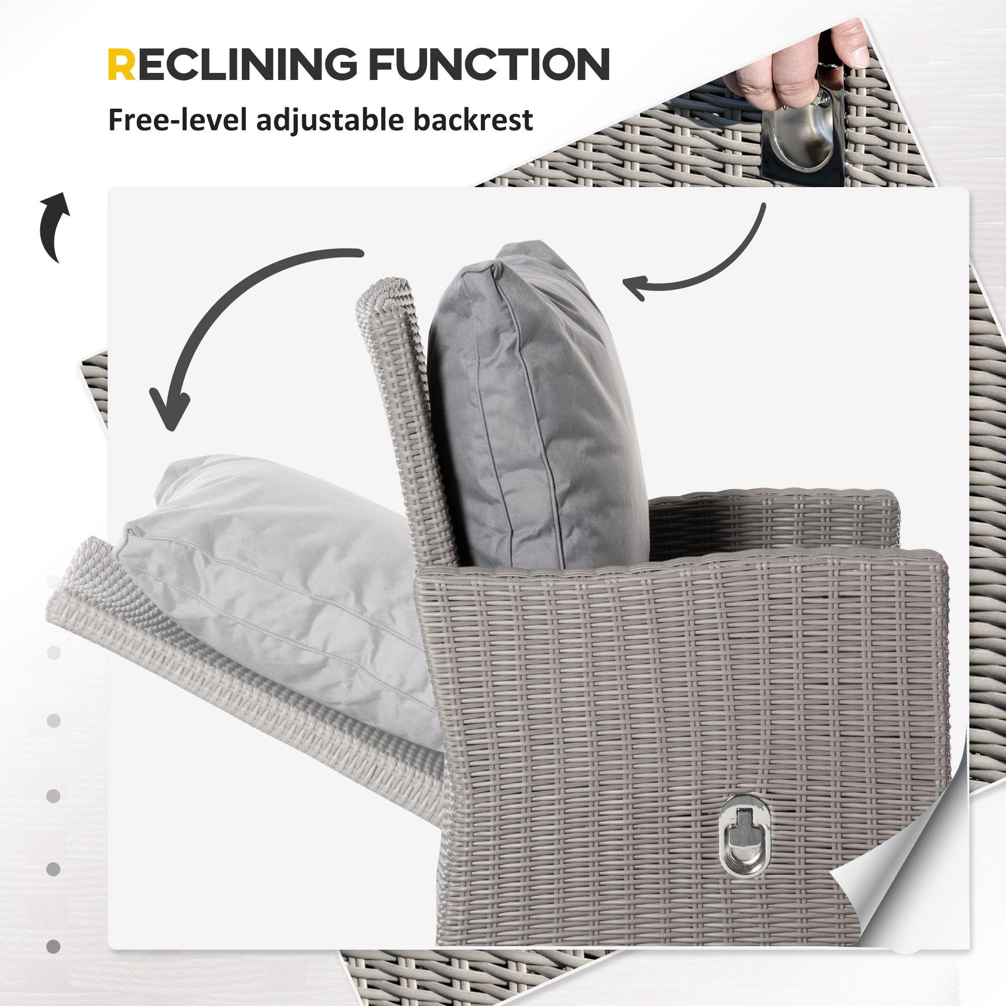 Sit back and relax in complete comfort with this rattan chair and stool set from. Formed of five pieces, the set includes two reclining armchairs, two footstools and a matching coffee table. Made from hand PE rattan with aluminium frame, each piece is sturdy, weather resistant and low maintenance. The table comes with an inner cooler to keep food and drink fresh and away from pests. The cushions ensure comfort for long periods. Each piece is finished with adjustable feet for balance.