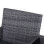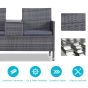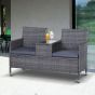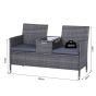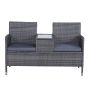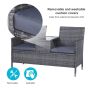 This double seat rattan chair using metal for the base frame to provide underlying strength for seasons to come, it is crafted into an all-in-one two seat and middle table design – giving space for you to sit with a friend with a place to keep drinks, books and smaller items right next to you. Dark grey in colour, PE wicker rattan is wrapped around the metal, giving this duo seat style and protection against mild weather damage to make it a long lasting addition in your garden. Fire-retardant for safety, thick cushions are placed on the seats for comfort, with water-resistant covers which can be cleaned for hygiene, with black tempered glass on the table for a smooth and sleek surface which is easy to keep clean.