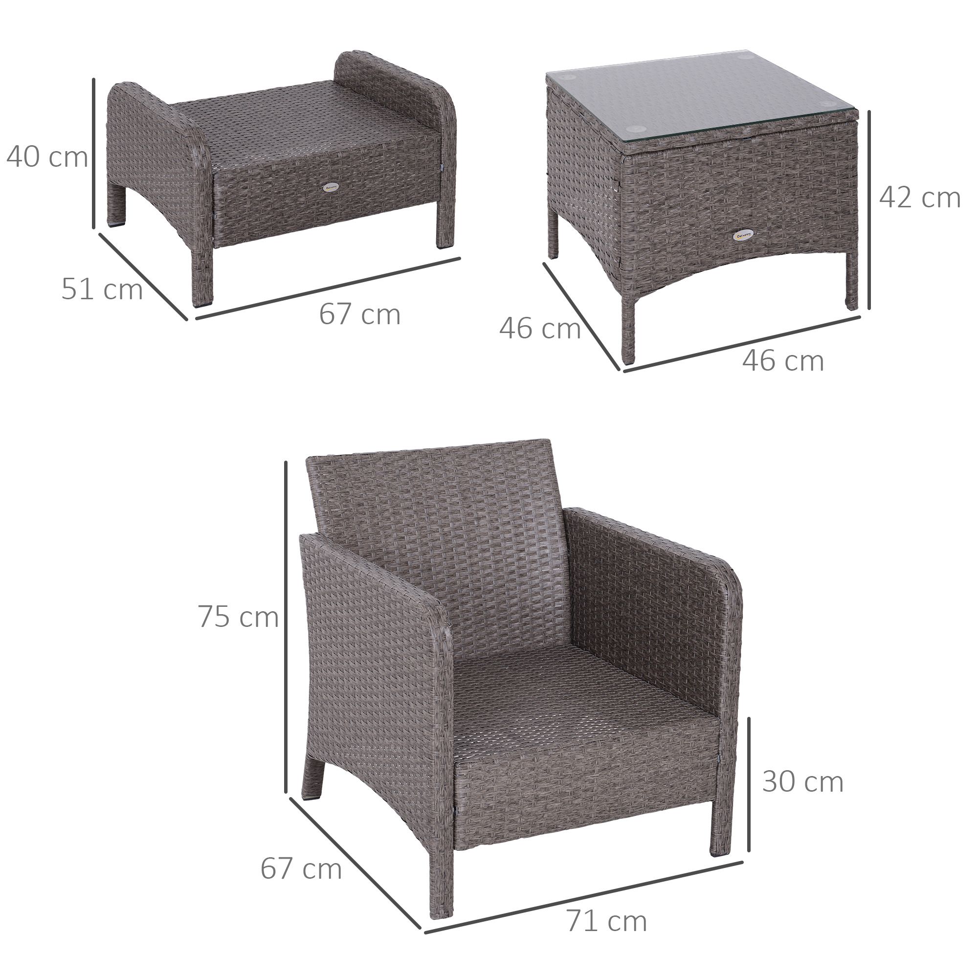 - Weight Capacity: 160kg (armchair), 70kg (footstool), 30kg (table)
