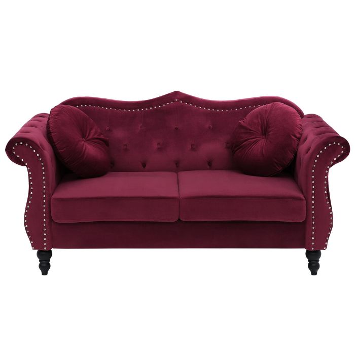 Enhance your interior with this elegant and glamorous sofa. Featuring tufted backrest and armrests, paired with nailhead trim, this piece is truly one of a kind, elevating any space to a higher level. Its design, heavily inspired by retro and vintage decor, easily fits within any living room or office space. Made from high-quality materials, it is incredibly durable, while its surface is covered with smooth to touch and easy to take care of velvet. Legs of the piece are made out of solid wood, which reinforce stability. The sofa comes with two throw pillows that feature a removable cover that translates to easy cleaning without a worry for stains, in matching colour and design Details: Color: Red, Black. Main material: Velvet. Additional material: Pine Wood, Eucalyptus Wood. Material Composition: 100% Polyester Weight: 46 Capacity: 2 People Assembly: Full Assembly Required Wood type: Pinus massoniana, Eucalyptus grandis Wood Origin: China Cushions Dimensions: 44x44 Legs Height: 16 Padding Thickness: 13 Seat Height: 44