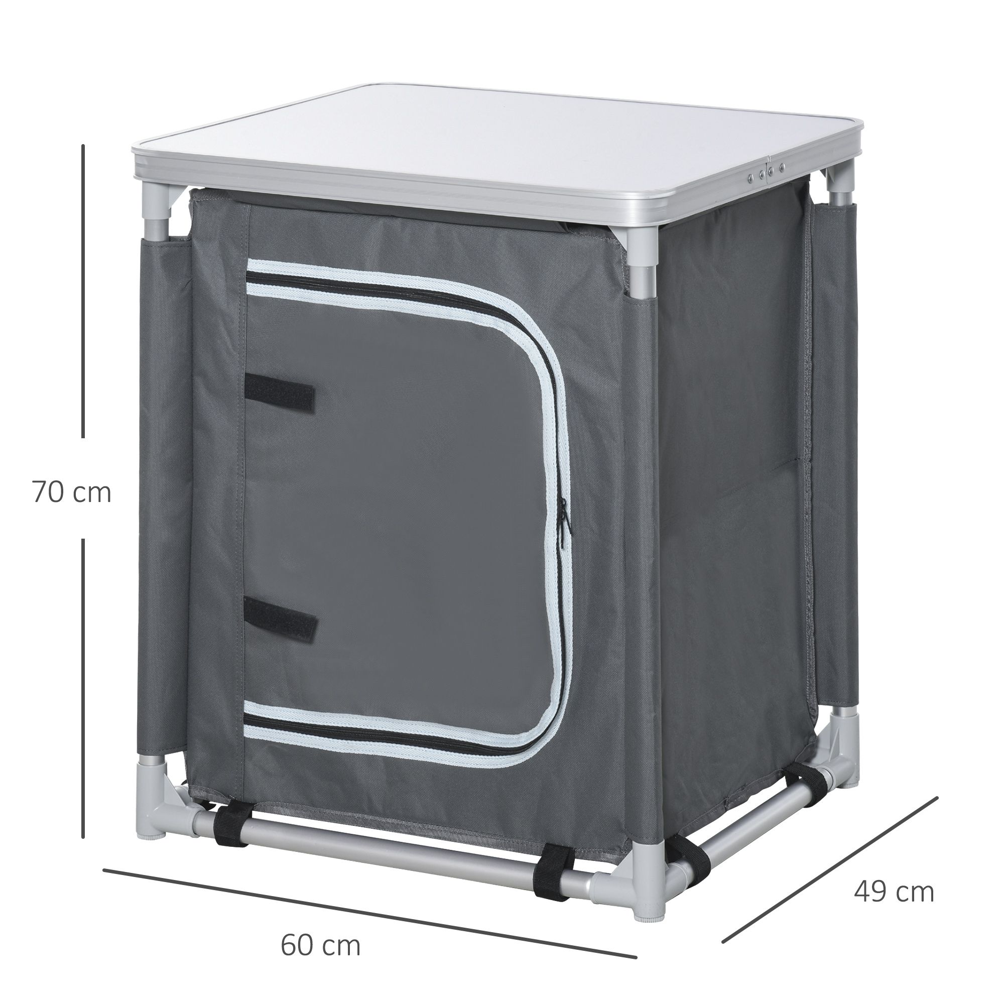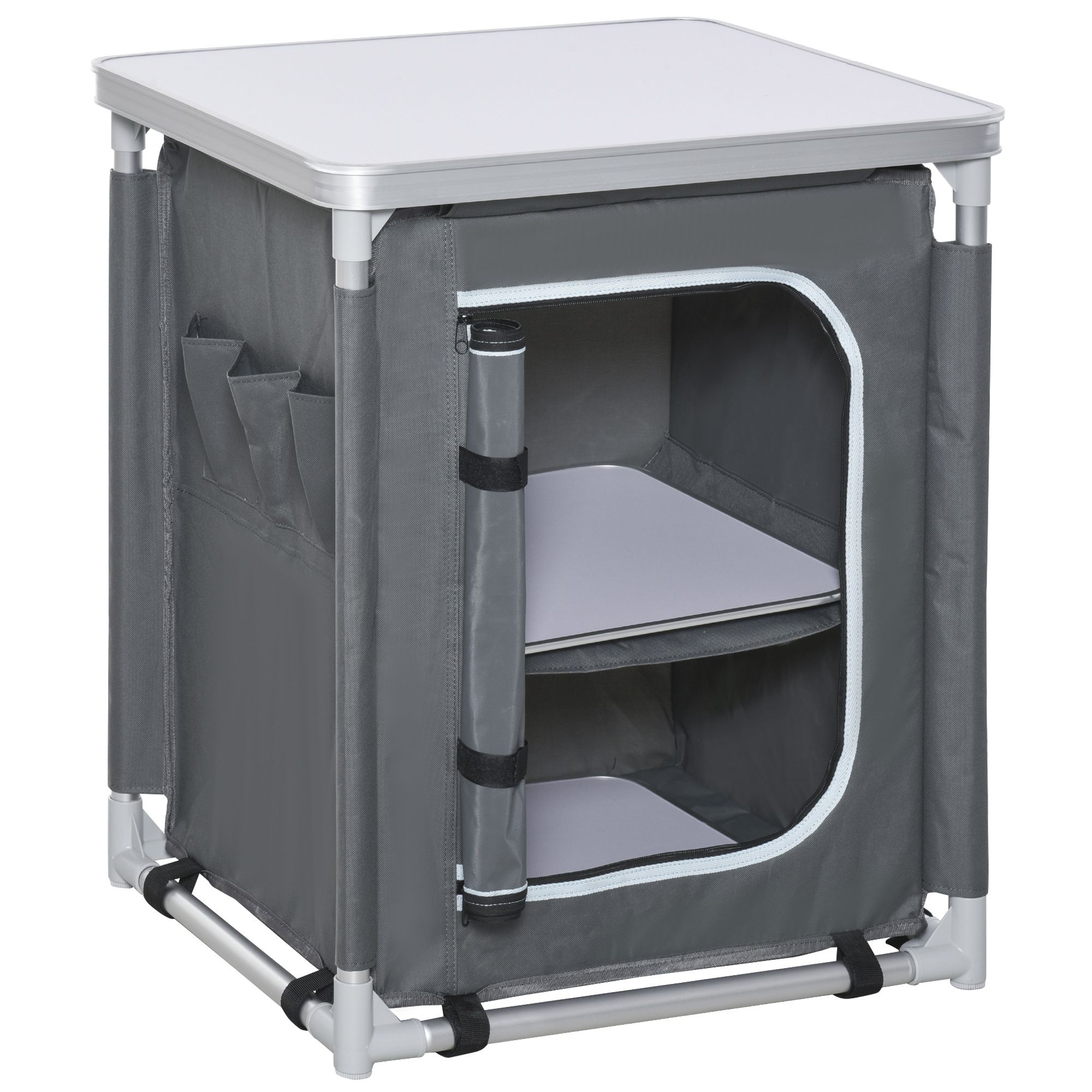 Ready when you are, this portable camping storage unit from is a must for your camping trips, outdoor gatherings and more. Made from aluminium, the camping cooking table is lightweight and tough for reliable repeated use. The fabric coat covering the frame is water-resistant and features a door to shield inside. There are two shelves for convenient storage, with the solid MDF table top giving you a flat and reliable surface to use. Comes complete with bag for easy carrying.