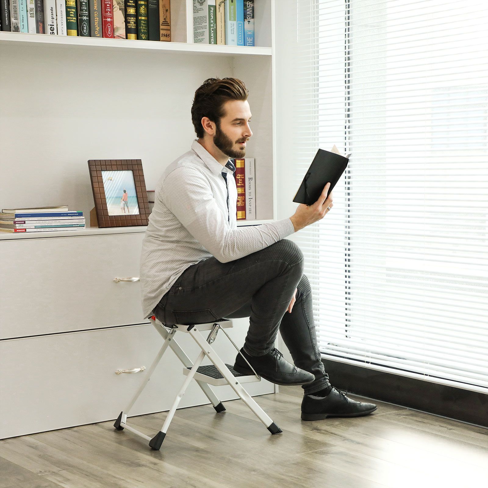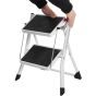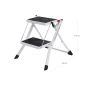 This step ladder from is particularly designed for daily use. Wherever you can not reach something, it helps you easily and safely reach it; folding design allows quick and space-saving storage after use. With a clear and simple look, the ladder fits in easily with many interior styles.4 feet with plastic and grooved anti-slip feet provide excellent stability and prevent tipping; safety locker prevents the ladder from accidentally closing during use.Extra large treadsat 30 x 20cm are comfortable for stepping on; concave and convex and anti-slip surface is beautiful and safe.The folding step ladder with compact dimensions and user-friendlyhandle is very easy to store and carry.Follow the instructions to fold the ladder; keep hands clear to prevent pinching!2 Step Ladder is the perfect little helper for daily life and housework, especially if you can't reach higher cabinets. Small and lightweight, easy to fold up, this folding ladder can be kept anywhere within your reach for convenience.Press down on the red button with your right hand while pulling the black handle up with your left hand.