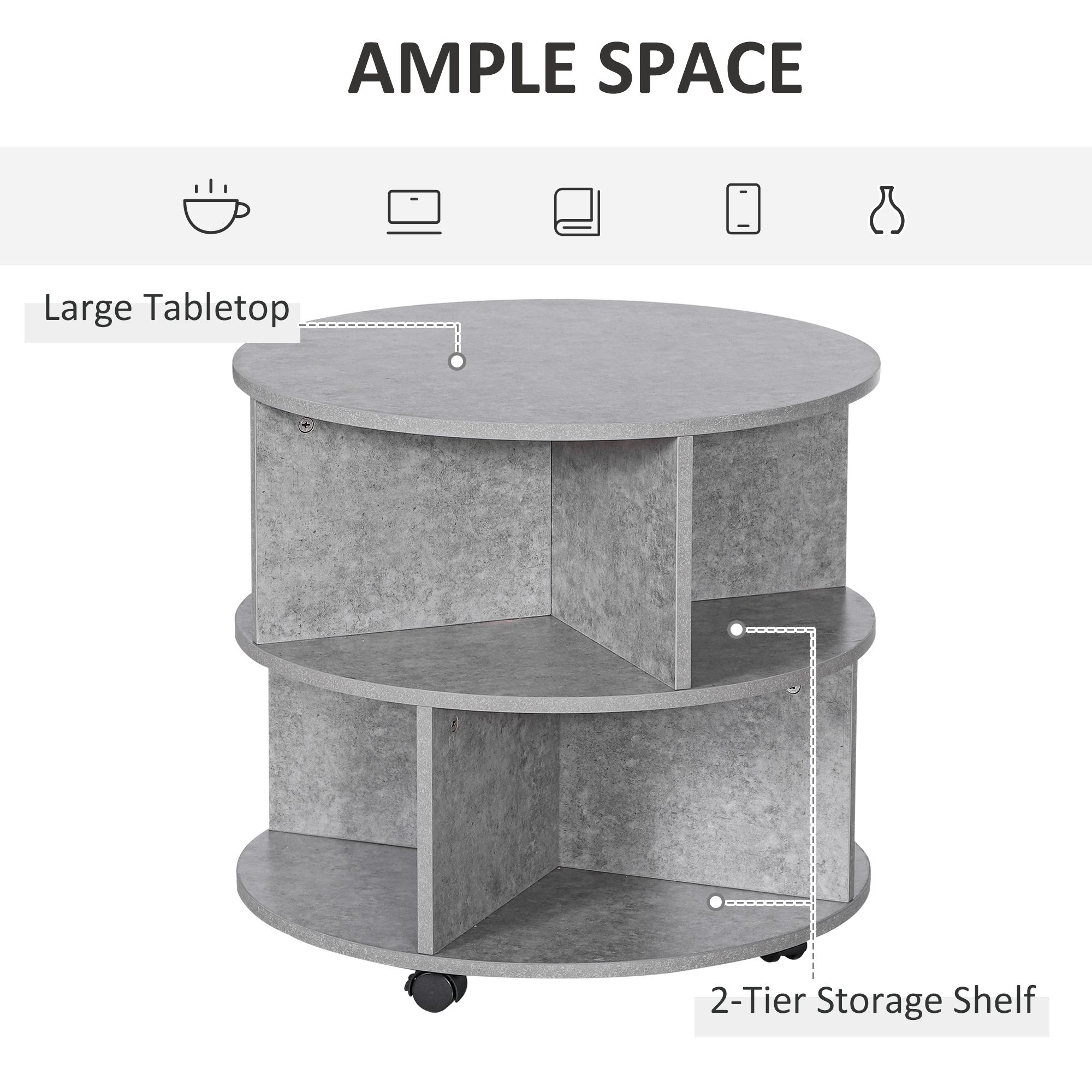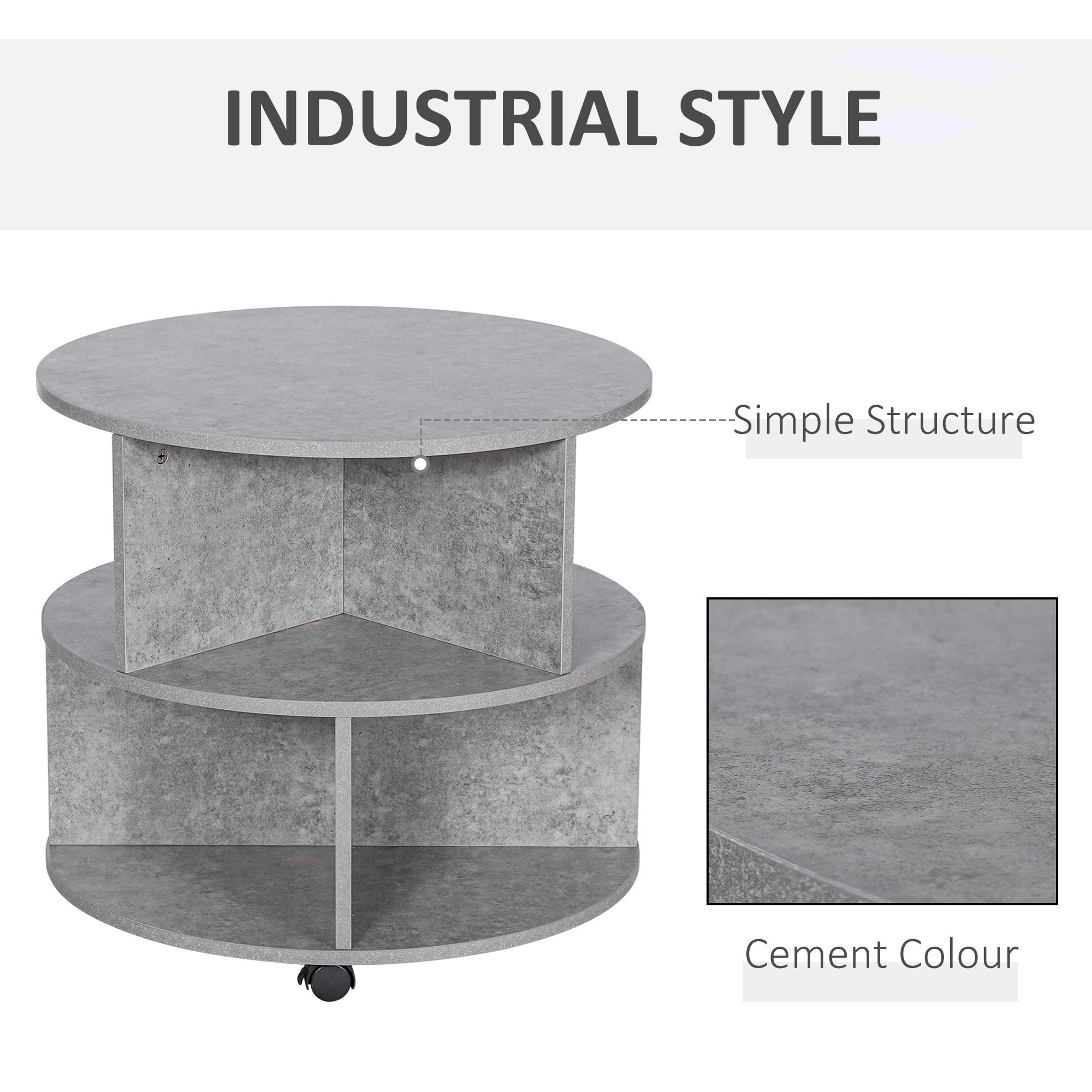 2 Tier Round Side End Table Coffee Desk with Divided Shelves Tea Table Storage Unit Living Room Organiser with Wheels - Cement colour