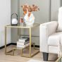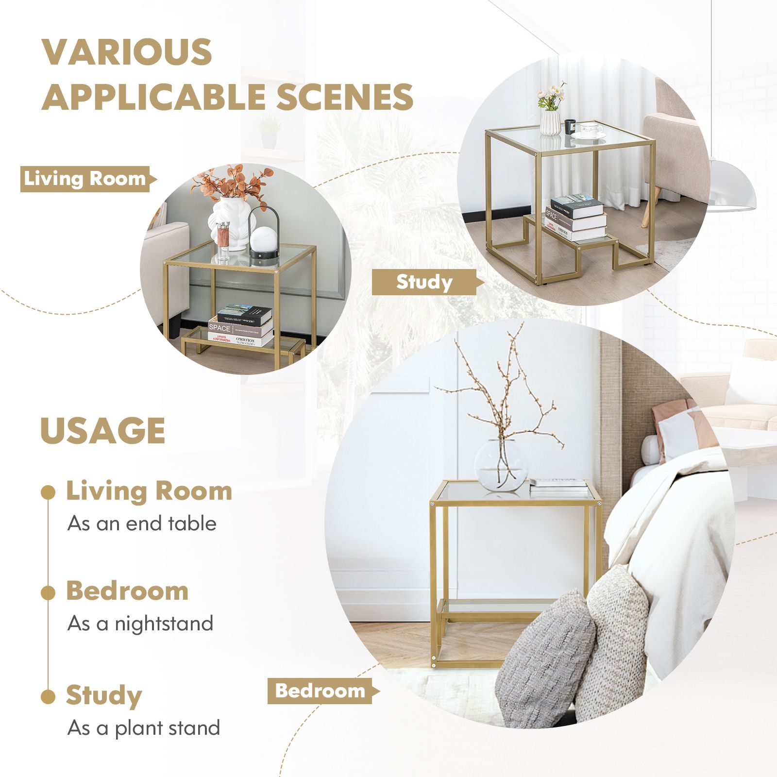 2-Tier Snack Table with Golden Metal Frame and Tempered Glass Tabletop