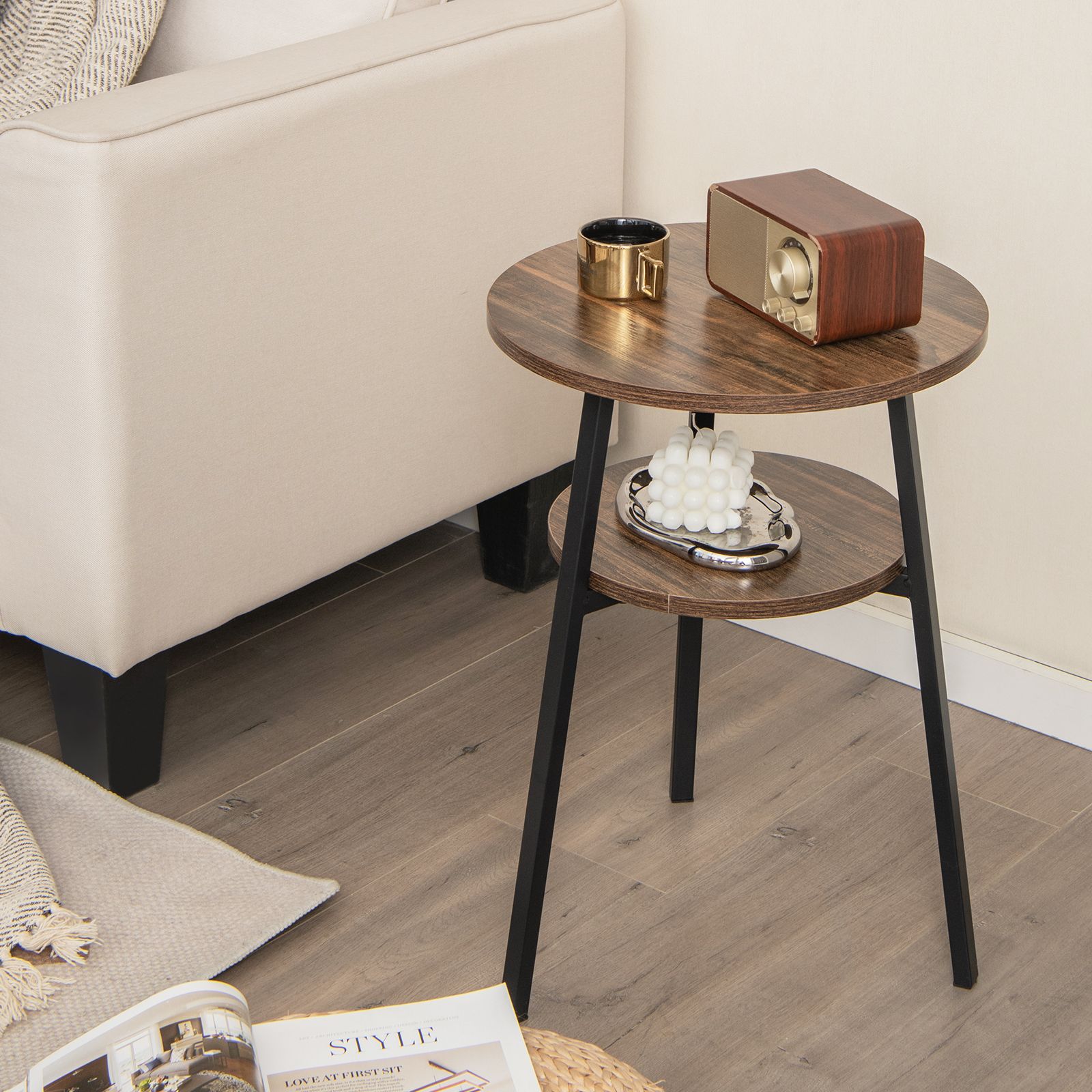 The design of the round side table conforms to modern minimalism without compromising functionality. With a beautiful wood grain finish, the industrial accent table breathes a rustic appeal to your living space. There is a 39cm diameter round tabletop and open storage shelves to offer ample storage space for living room sundries or bedtime essentials. And the sturdy construction made of high-strength metal pipes allows the end table to hold great weight. What's more, the rustproof metal frame offers a longer service life. With more details, like the sleek edge and non-slip foot pads, the small coffee table will give you a better experience. 2-Tier Storage Shelf: The versatile round-end table has a spacious tabletop and an open storage shelf, offering ample space for lamps, photos, plants, cups, etc. The tabletop can support up to 50kg, which makes the 2-tier tea table work well as a sofa side table, a plant stand, and a nightstand.Perfect for Small Space: The measurement of the side table is 39 x 39 x 54cm(L x W x H), which matches most sofas or beds while fitting snugly into small spaces. With a space-saving design, the small coffee table suits for bedroom, living room, hallway, and study room.Heavy-Duty Metal Frame: To provide reliable support to the 2-tier shelves, the round sofa side table features a robust metal framework that lasts for long thanks to the rustproof coating. In addition, the 3 legs form a stable triangular structure for good stability, with non-scratch foot pads at the base to prevent scratching the floor.Ideal Room Decor: If you are looking for retro and elegant home furniture, this compact accent table will be a good choice. The collision of rustic wood grain and matte black metal frame brings a contradictory yet stylish flair, making the bedside table look well with different room decorations.Easy to Assemble and Clean: An easy-to-follow instruction and all labeled parts are provided for easy assembly. You can quickly find out how to put it together. Besides, the tabletop with beautiful wood grain is waterproof and wear-resistant, allowing you to wipe off the dirt with a soft cloth.