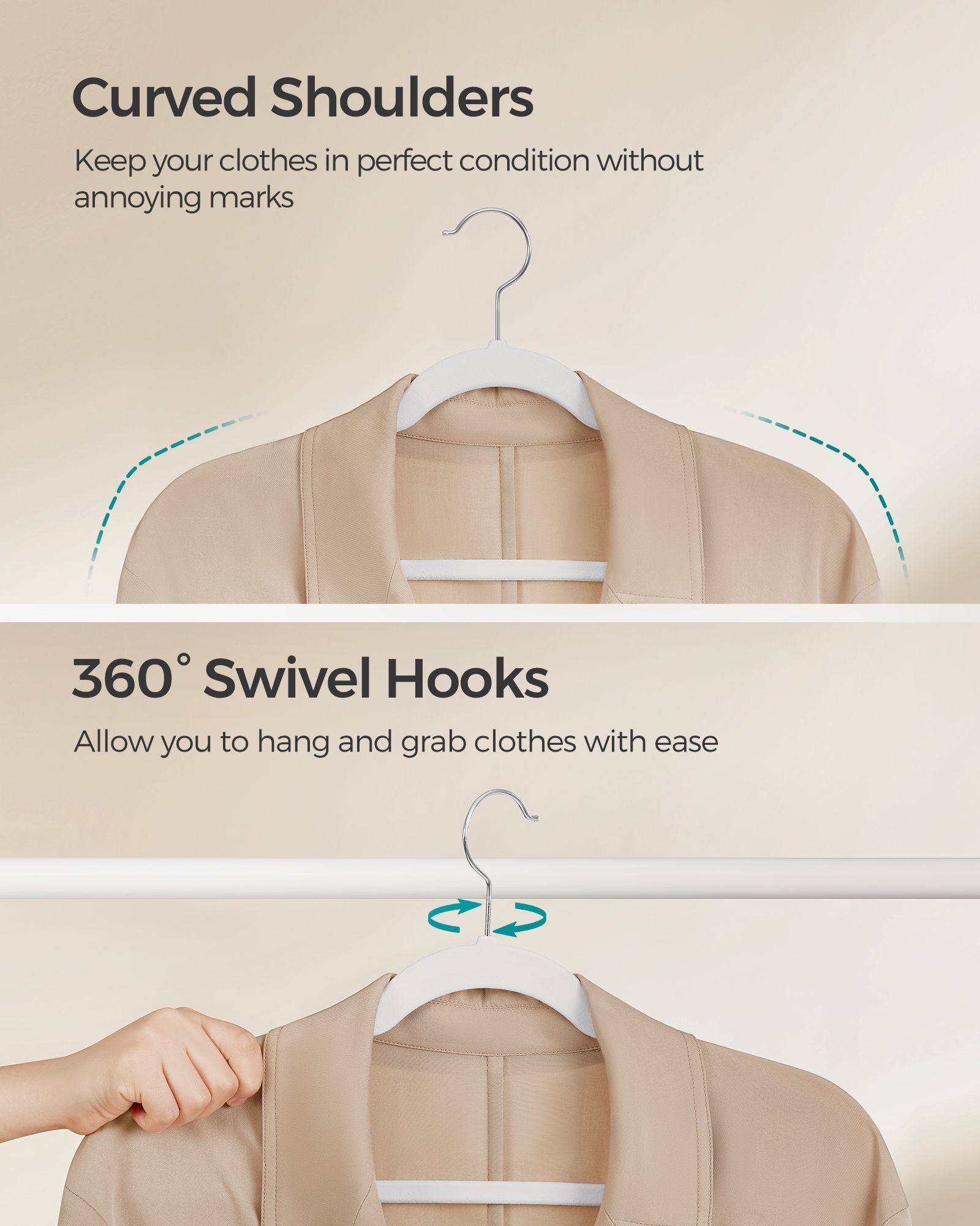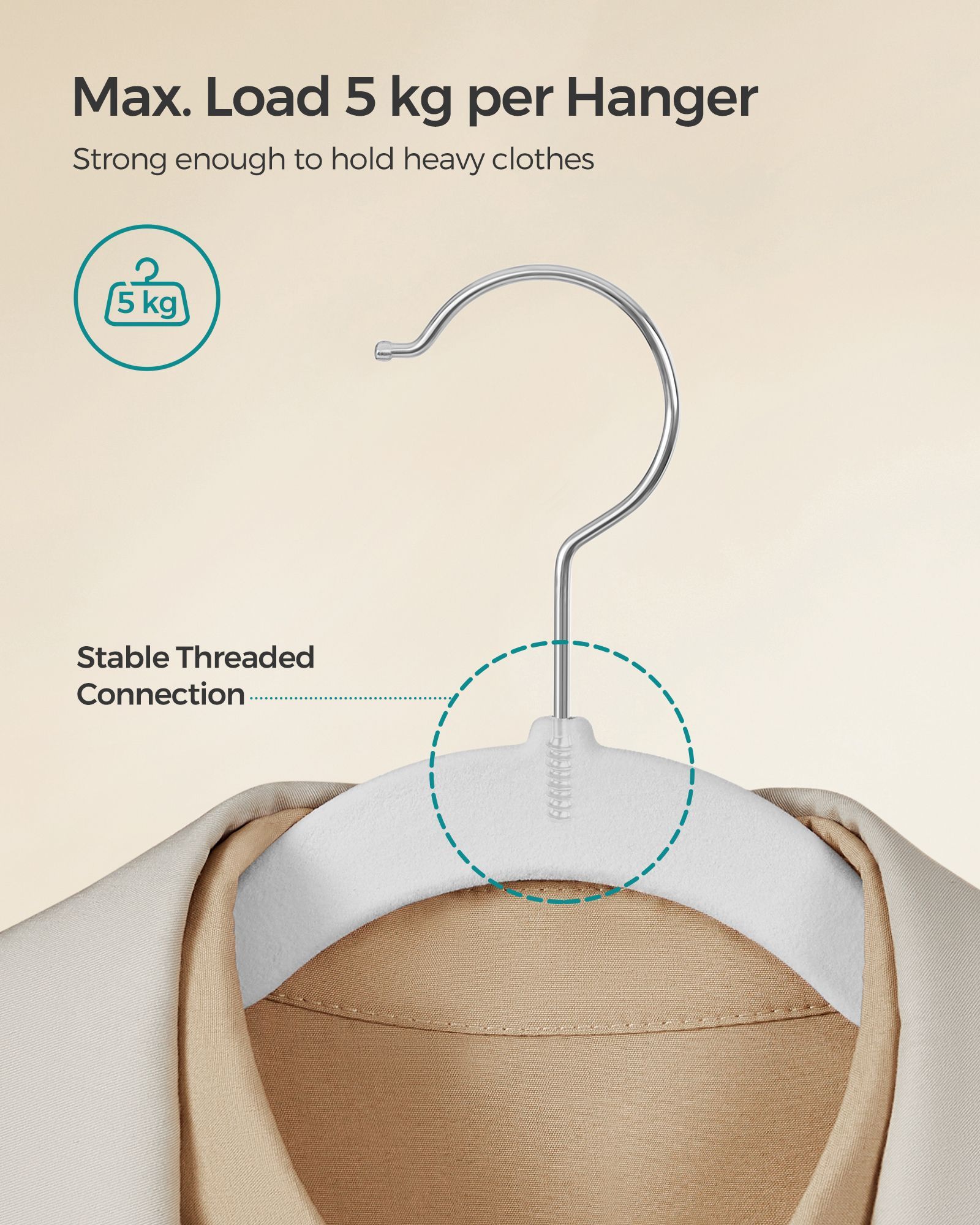Maximize your closet space with this 20-pack of cloud white velvet hangers. Crafted for both functionality and style, these hangers feature a soft velvet surface to prevent clothes from slipping. The slim design saves space while the sturdy construction ensures durability. Upgrade your closet organization with these elegant and practical hangers.