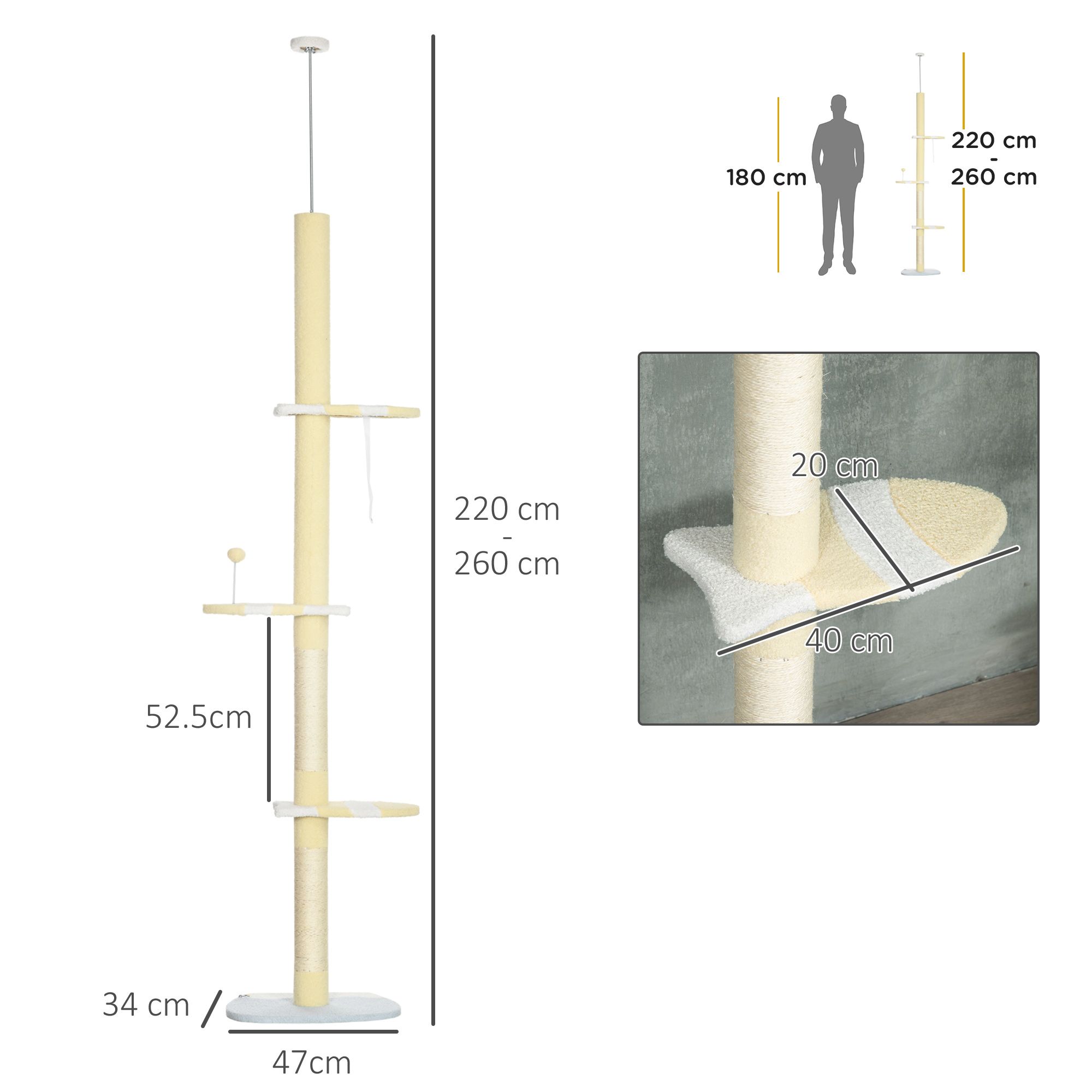 - Floor-to-ceiling Cat Tree: Features scratching posts, perches and a ball toy, offering endless opportunities to climb, play and rest. This tall cat tree ranges in height from 220 cm- 260 cm with the tension rod. When the tension rod is sufficiently compressed, your cats can climb up to the top and take in the view.