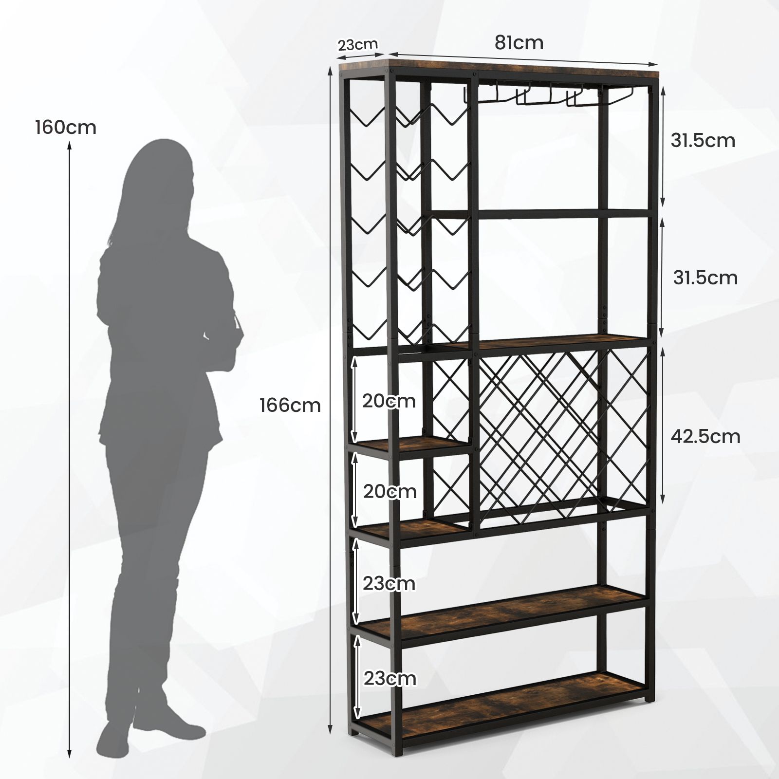 Overall Dimension: 81 x 23 x 166 cm(L x W x H) Distance Between Each Shelf:31.5/31.5/20/20/23/23 cm Bottle Capacity: 27 Glass Capacity: 16 Suitable Bottle Size:5.5-9 x 20-35 cm (D x L) Weight Capacity of Each Shelf: 45 kg