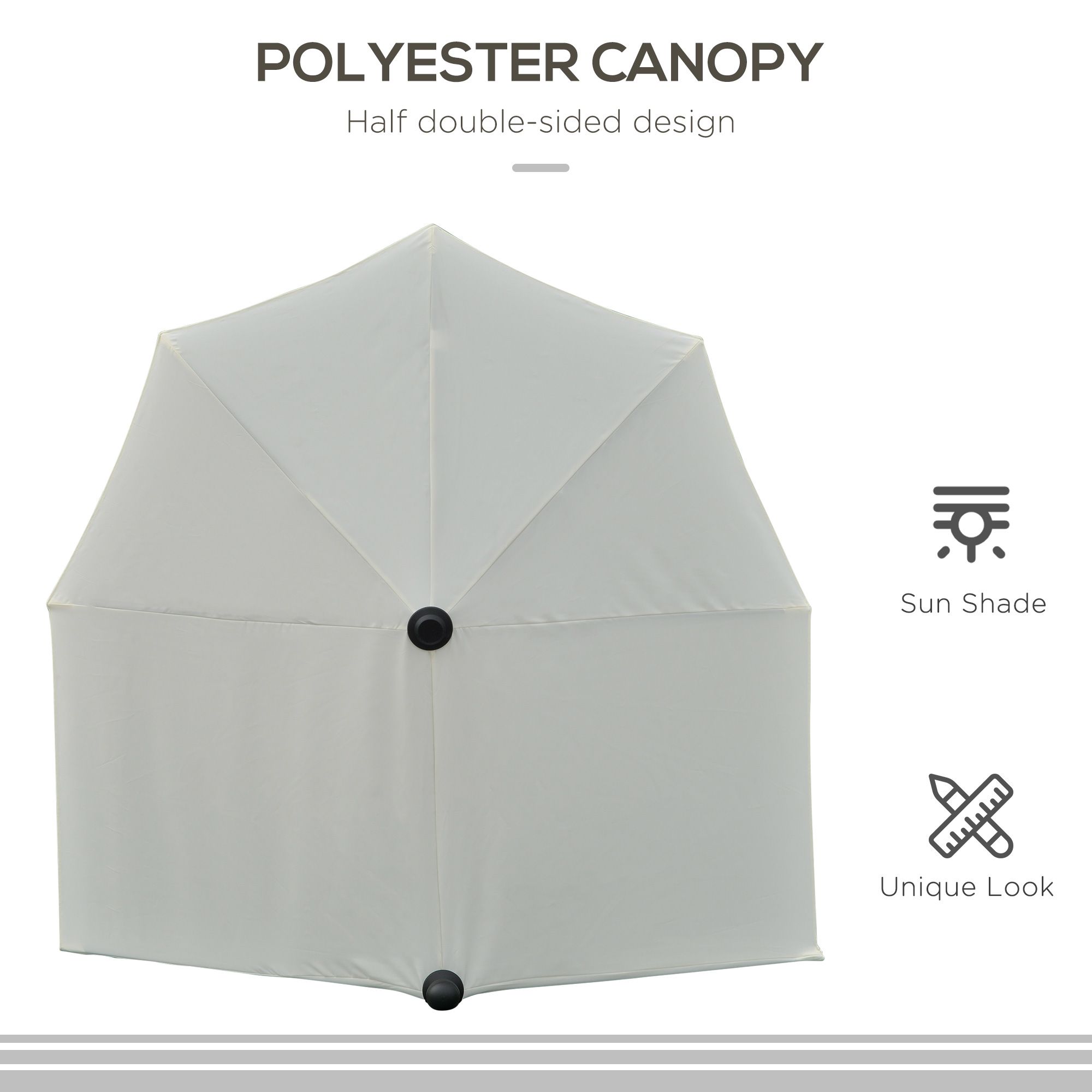 - HALF-CUT DESIGN, DOUBLE-SIDED CANOPY: Parasol umbrella is specially designed to stand against a wall, window or fence, great for small garden and outdoor spaces - such as balconies, small patios, front porches and more garden and outdoor spaces. Extended canopy for extra shade.