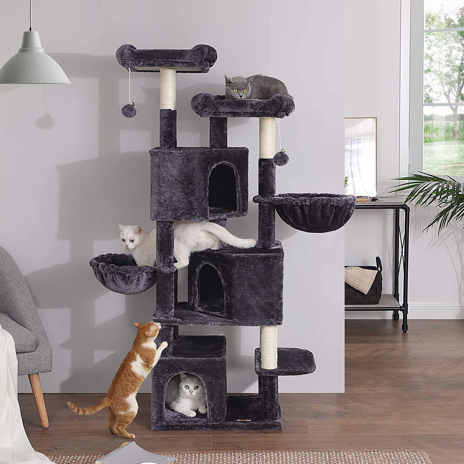 Inside the creative workshop of FEANDREA, two sweet kittens jump around, personally examining our scratching trees and giving their animal feedback. Thus, the designers of FEANDREA get to know firsthand whether the products meet the requirements of pampered whisker wearers.The highlights of the cat tree at a glance:- High stability; has a base plate reinforced with wooden strips, as well as an anti-tip kit- Robust sisal posts- Covered with fluffy, extra-durable plush fabric- 3 cat houses, 2 basket loungers, 2 observing platforms- Extra-large; suitable for several cats- Stair-like arrangement of the individual elements; simplified ascent- Fun fur balls with bells