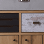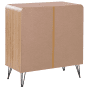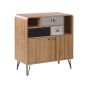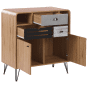 This sideboard inspired by the 60s and 70s furniture trends fits seamlessly within any modern interior design scheme. The body with rounded edges is finished in oak wood effect laminate and placed on metal hairpin legs. The cabinet works great in any bedroom, living area or hallway. Closed storage and three, seemingly misplaced drawers bring retro charm to any room. Details: Color: Light Wood, Black, Grey. Main material: Particle Board. Additional material: Metal. Weight: 35 Assembly: Full Assembly Required Legs Height: 16