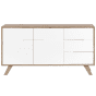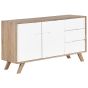 Bring a stylish Scandinavian vibe to your living room with this minimalistic sideboard in a classic mix of light wood and white. Drawers and cabinets make it a perfect storage solution for magazines, controllers or documents. The sturdy engineered wood ensures exceptional durability and an excellent look for years to come. Its simple design and sleek construction fit with any home decor. Details: Color: Light Wood, White. Main material: MDF. Additional material: Pine Wood. Weight: 46 Assembly: Full Assembly Required Wood type: Pinus massoniana Wood Origin: China Legs Height: 15