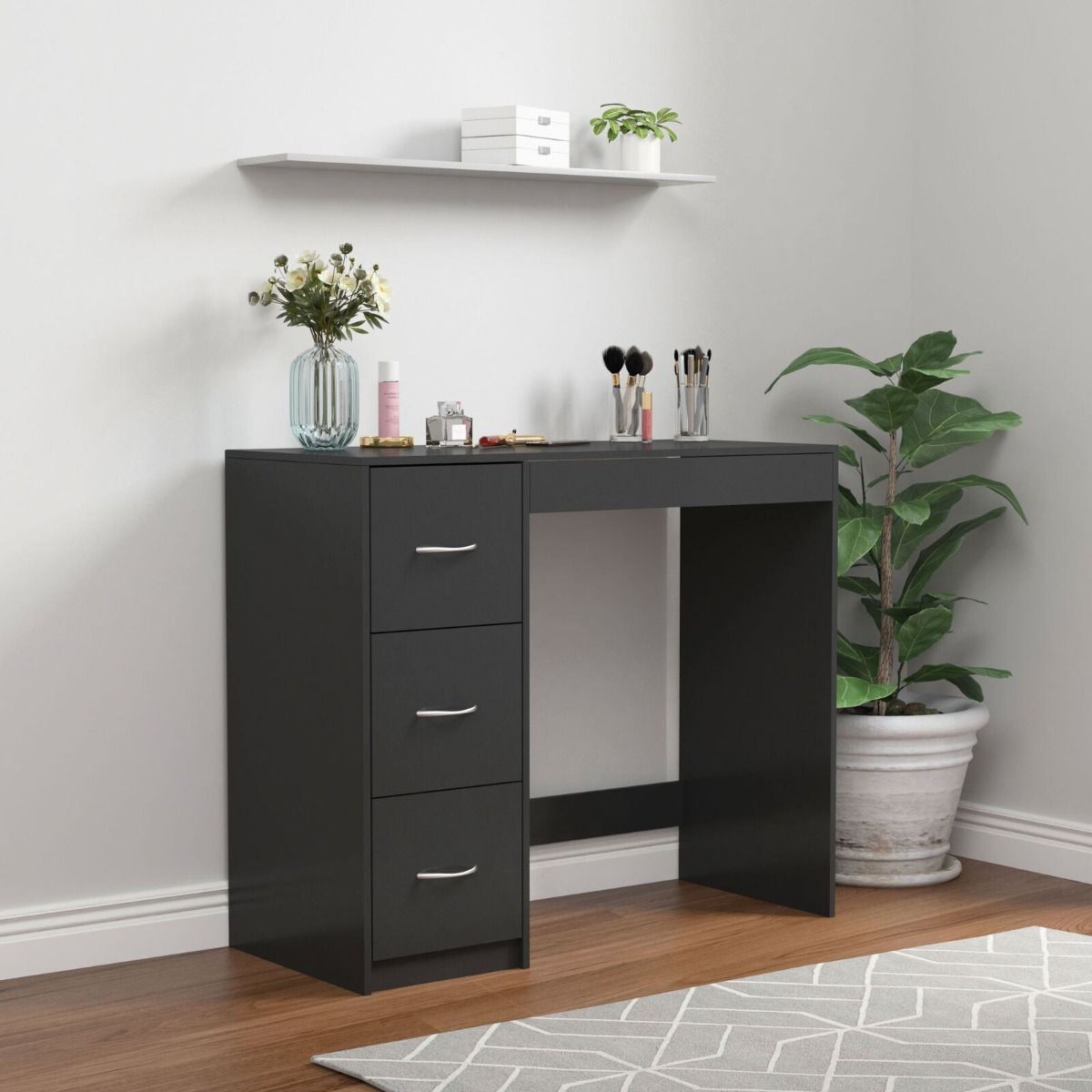 This table is a fantastic addition to your bedroom or office. There are 3 drawers on smooth metal runners for keeping your makeup and jewellery neatly out of sight, so all you need to do is add a mirror and you're good to go. Easy cable access allows you to set up your computer to a power source with ease and a spacious drawer to take care of all your office supplies. Metal handles complete the look, with a high-shine chrome finish.
