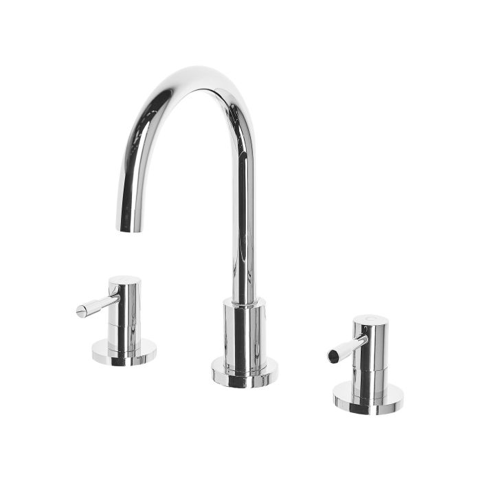A mixer tap is a functional addition to your bathroom. Functional character doesn't mean that a basin tap cannot be stylish. Elegant polished silver finish and modern, curved tap will complete the look of your bathing area. Two separate handles make it easy to precisely regulate the flow and temperature of water. Details: Color: Silver. Main material: Brass. Additional material: Aluminium, Stainless Steel, Zinc. Weight: 1 Assembly: Requires Installation