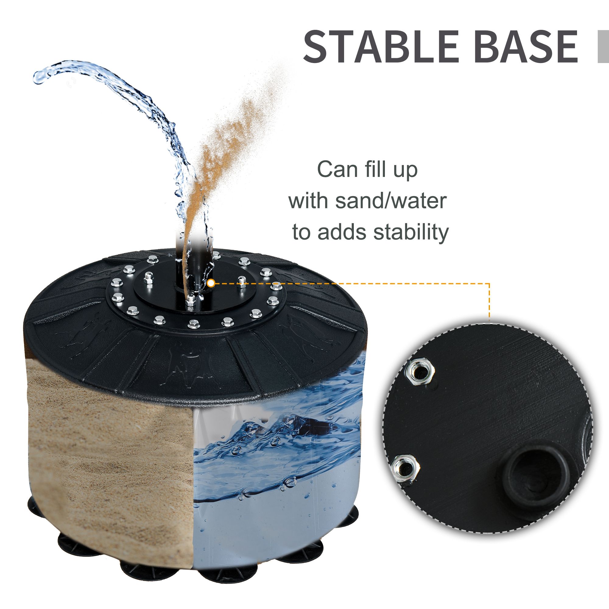 - Stable HDPE base can be filled with water or sand