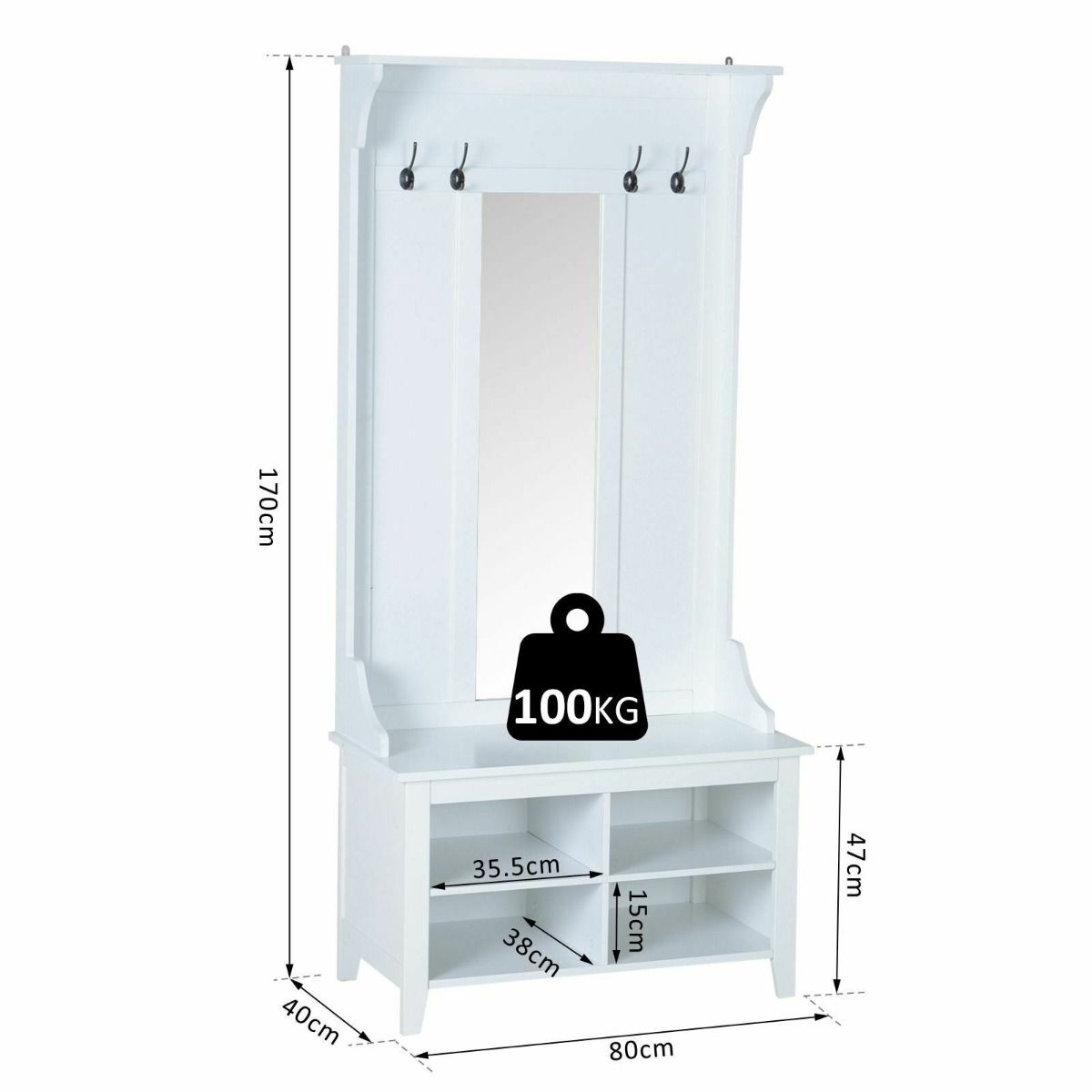 - 3-in-1 design with a four coat hooks, a mirror, a top shelf space and four shoe storage cubes