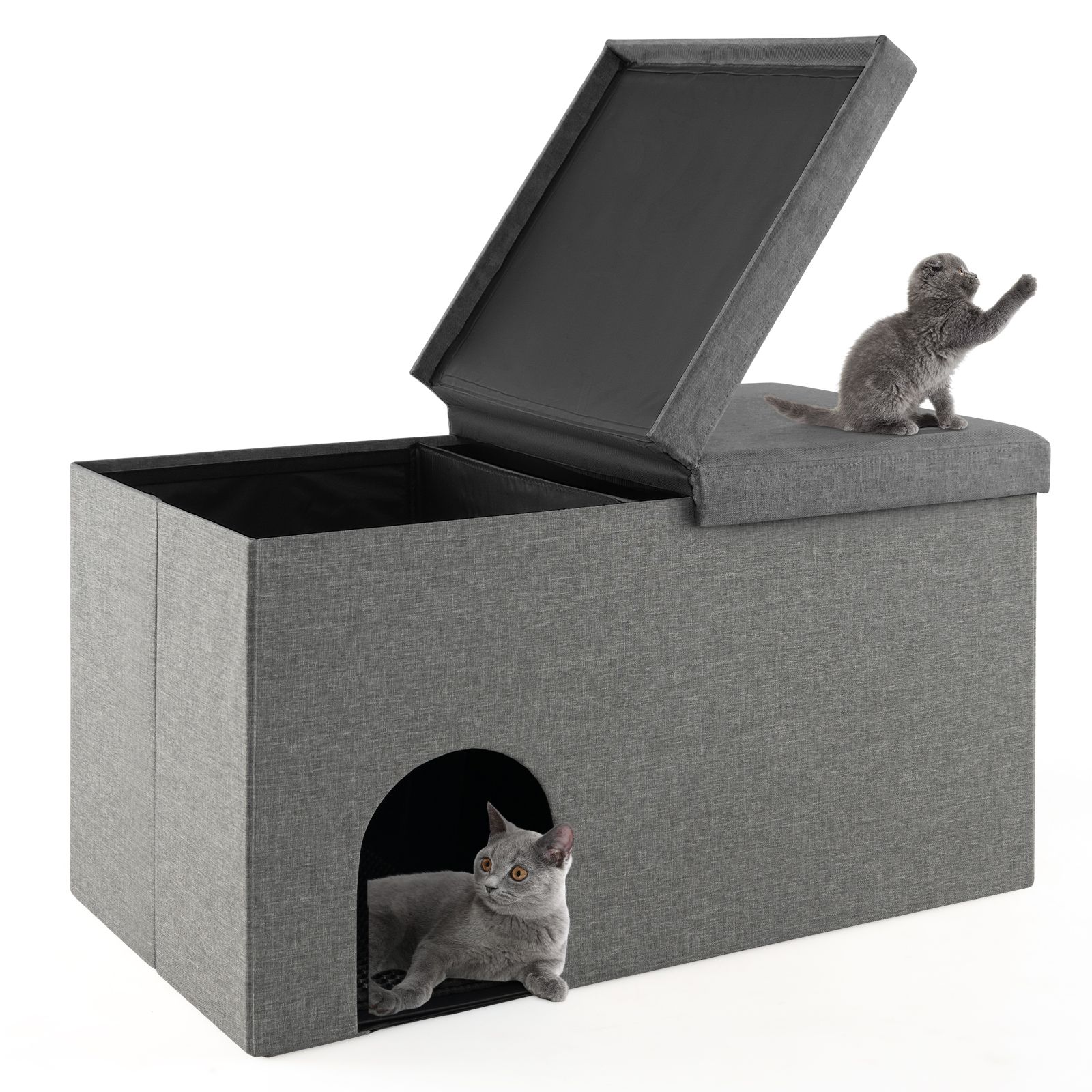 Provide Your Cat with a Private and Odor-Free Space while Keeping Your Home Clean! This foldable cat litter box enclosure measures 90 x 50 x 50 cm (L x W x H), which can also act as an ottoman for you to sit on or rest your feet, a shoe bench to tidy up your footwear, and even a storage cabinet. It offers private space for your lovely furry friend and can also be a good solution to prevent litter from being scattered everywhere and reduce unpleasant smells. Besides, thanks to its flip lid and cat litter mat, cleaning up after your cat has never been easier. And there exists an odor control carbon filter, which helps to absorb and neutralize any unwanted smells. Besides, the 4-layer upholstered top seat (linen fabric/high-density sponge/MDF board/waterproof inner) not only provides sturdy support, but also ensures a comfortable and breathable seating experience. And installing the ottoman is also a breeze, which can be completed in just a few seconds. Privacy Protection: The hidden cat litter box enclosure can be a perfect spot for kittens to enjoy private potty time while reducing unpleasant smells and reducing litter tracking. Besides, it comes with a leak-proof double-layer cat litter mat to collect scattered litter brought out by your cat. Easy to Clean: The hidden cat washroom bench features a flip door design, which is convenient to scoop litters and clean inside. Besides, there exists an odour control carbon filter under the lid, which helps absorb odour. And the interior adopts waterproof liners, which would not absorb urine, making cleaning a breeze. Multifunctional Design: This versatile cat furniture can be used as a cat litter box enclosure, ottoman, shoe bench, or storage cabinet, which could hide the cat litter box while decorating your home. Furthermore, it could hold up to 200 kg, which can easily withstand the weight of 2 adults. Premium Upholstered Top Seat: The padded top seat provides an ideal place to perch and remove shoes. It is covered by breathable linen fabric and filled with high-density sponge, ensuring a soft and skin-friendly seating experience for you and your pet. Foldable Design and Effortless Assembly: The hidden litter box furniture can be easily folded into a flat size, allowing for space-saving storage and convenient transportation. Moreover, it is easy to set up in seconds, requiring no tools. The cat litter box features 90 x 50 x 50 cm (L x W x H) and please measure the size of the cat litter box before purchase.