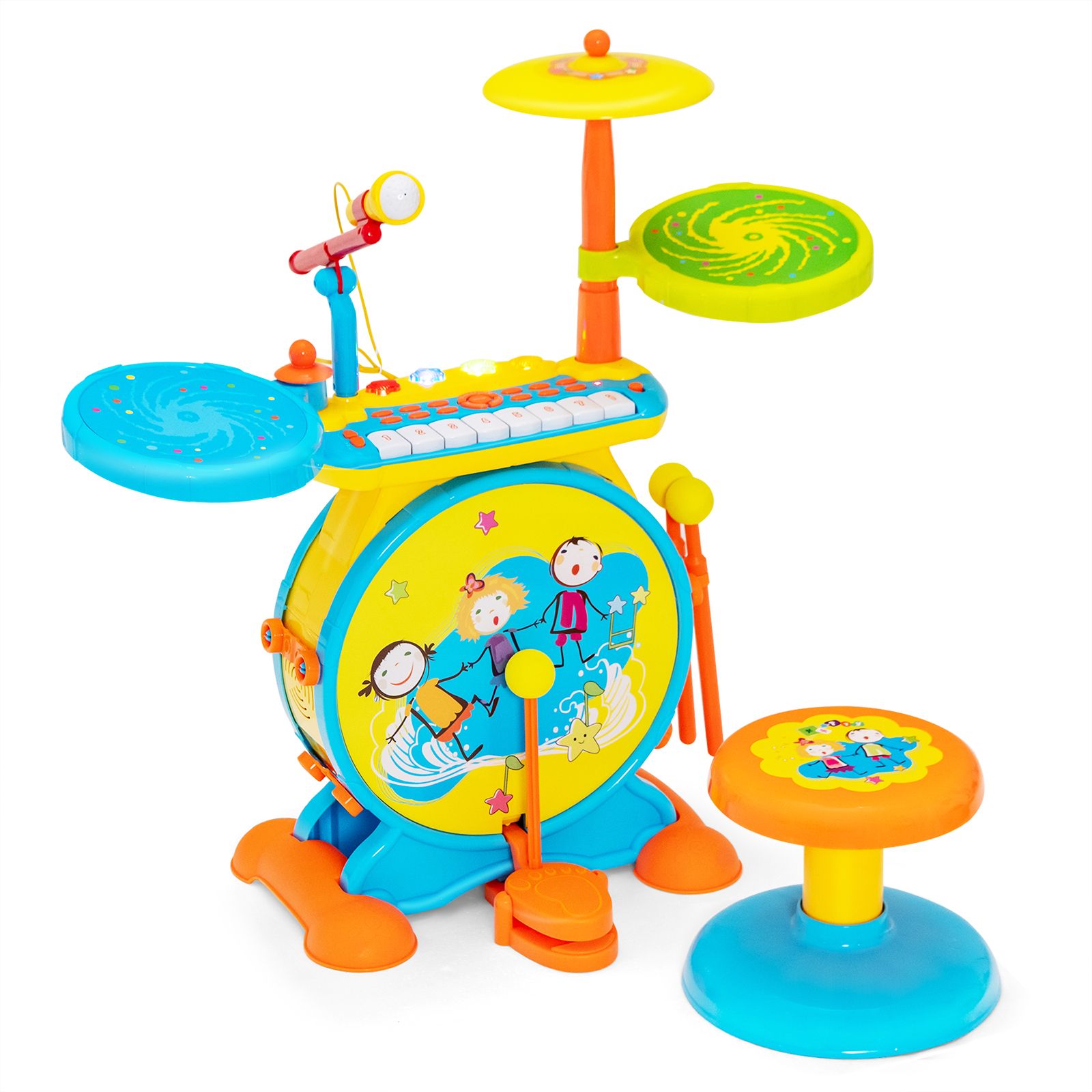 Package Includes: 1 x Kids' keyboard and drum set 1 x Stool 2 x Drum sticks 1 x Microphone 1 x MP3 data cable 1 x Instruction