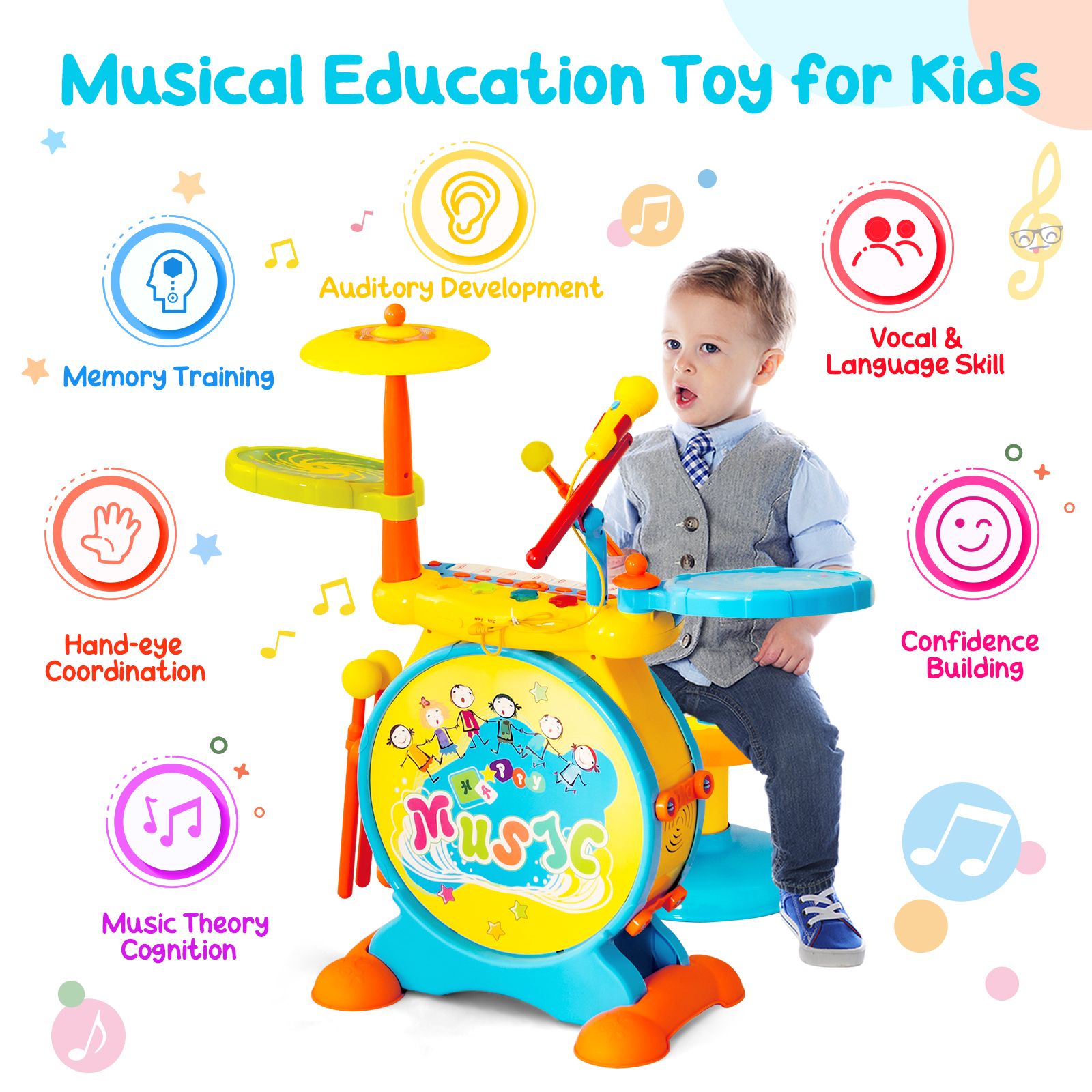 This 8-key digital keyboard and drum set is a fun companion for your child for a happy childhood. It is equipped with 4 types of musical instruments, 4 rhythms, and 8 demos for music enlightenment. In addition, the chord function, echo effect, and 3 sound types of the drum and cymbal enrich the sound effect of the toy while bringing kids tons of fun. Kids can press the record button before practicing, and then replay the music when finished. The high-quality loudspeaker and 16-level adjustable volume improve auditory comfort. Apart from striking the drum set, kids can also showcase their pleasant singing voices with the microphone. Even better, with an audio input function the drum and keyboard set can be connected to your mobile phone, iPad, or computer to play music and story. There are more details for your little musician to explore. Early Musical Enlightening: This 8-key digital keyboard and drum set combination offers 4 types of musical instruments (piano, music box, guitar, and organ), 4 rhythms (rumba, march, waltz, and tango), and 8 pieces of demos. It's a versatile musical instrument to give your child music enlightenment.Considerate and Safe Design: The digital piano keyboard is designed with kids-sized keys, which are easier for toddlers to press. Besides, smooth edges and rounded corners prevent kids from accidental bruises, so they can sit on a comfortable stool to enjoy hours of fun.Deluxe Sound Effect: The drum kit and cymbal feature 3 convertible sound types and echo effects, bringing kids a fantastic music feast. Children can also choose the chord function and 16-level volume adjustment to experience different sound effects. What’s more, the record/replay button enables kids to review their performance.MP3 Cable and Microphone Function: With a built-in microphone and MP3 cable, you can connect the keyboard to your phone, tablet, or computer to play music and stories. Kids can sing their favorite song with the adjustable microphone for entertainment. Plus, 4 soft LED lights create a pleasant atmosphere when playing.Perfect Gift for Your Kids: The multifunctional musical toy is conducive to kids’ music theory cognition, hand-eye coordination, vocal and language skill, memory training, auditory development, confidence building, etc. It’s a great gift choice for your little ones on any occasion.