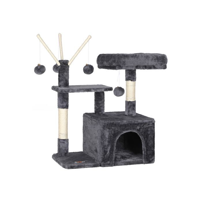 Inside the creative workshop of FEANDREA, two sweet kittens jump around, personally examining our scratching trees and giving their animal feedback. Thus, the designers of FEANDREA get to know firsthand whether the products meet the requirements of pampered whisker wearers.The highlights of the cat tree at a glance:3 pompoms for more fun;1 viewing platform for relaxation;1 comfortable cat cave for playing hide-and-seek;Soft plush fabric to make your cats feel like you're holding them in your arms.