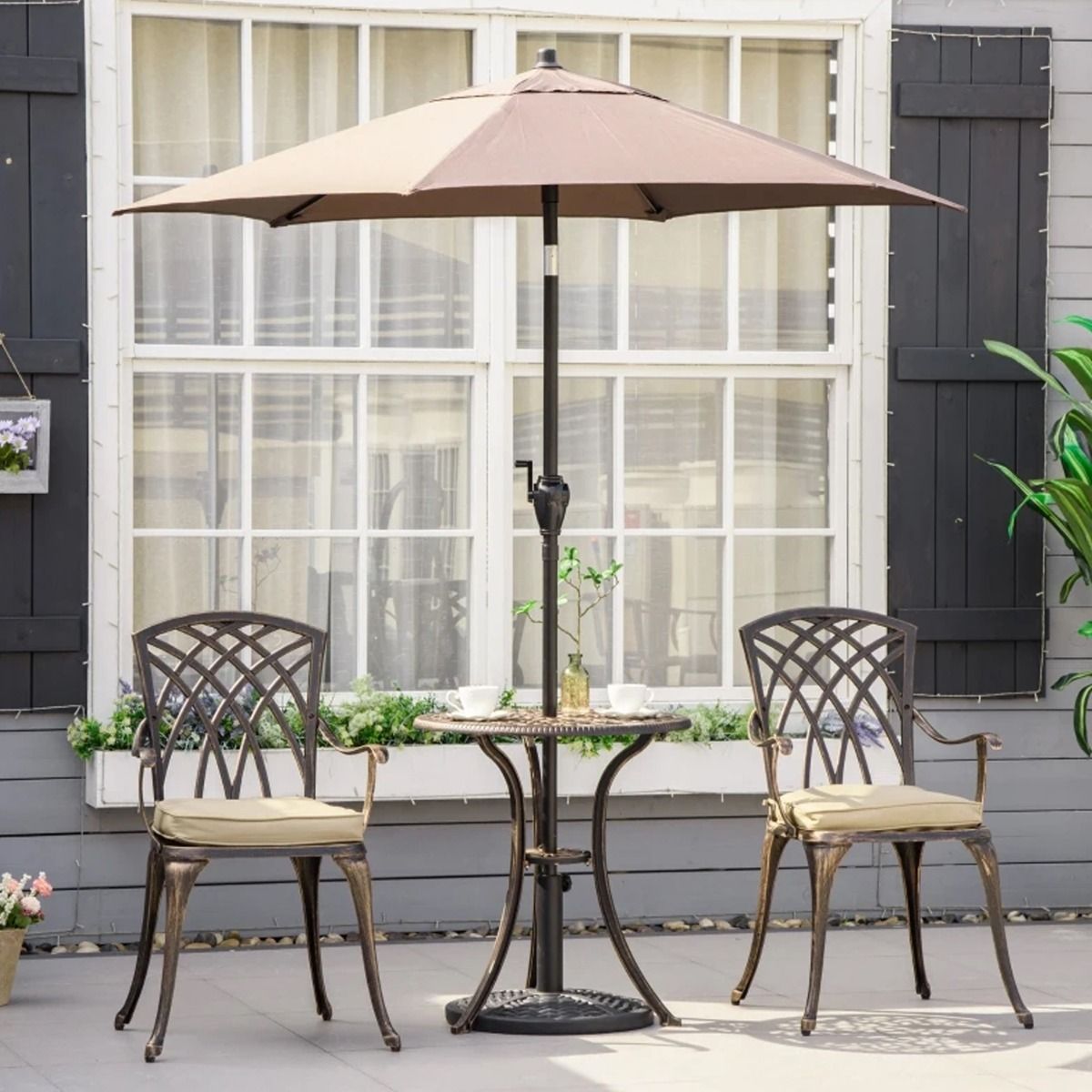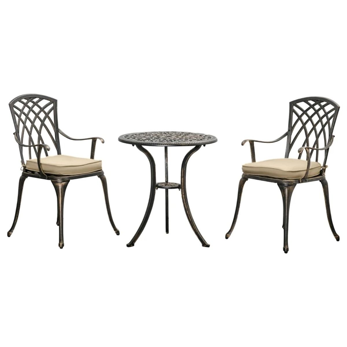 - Three-piece bistro set that includes a round table and two matching chairs