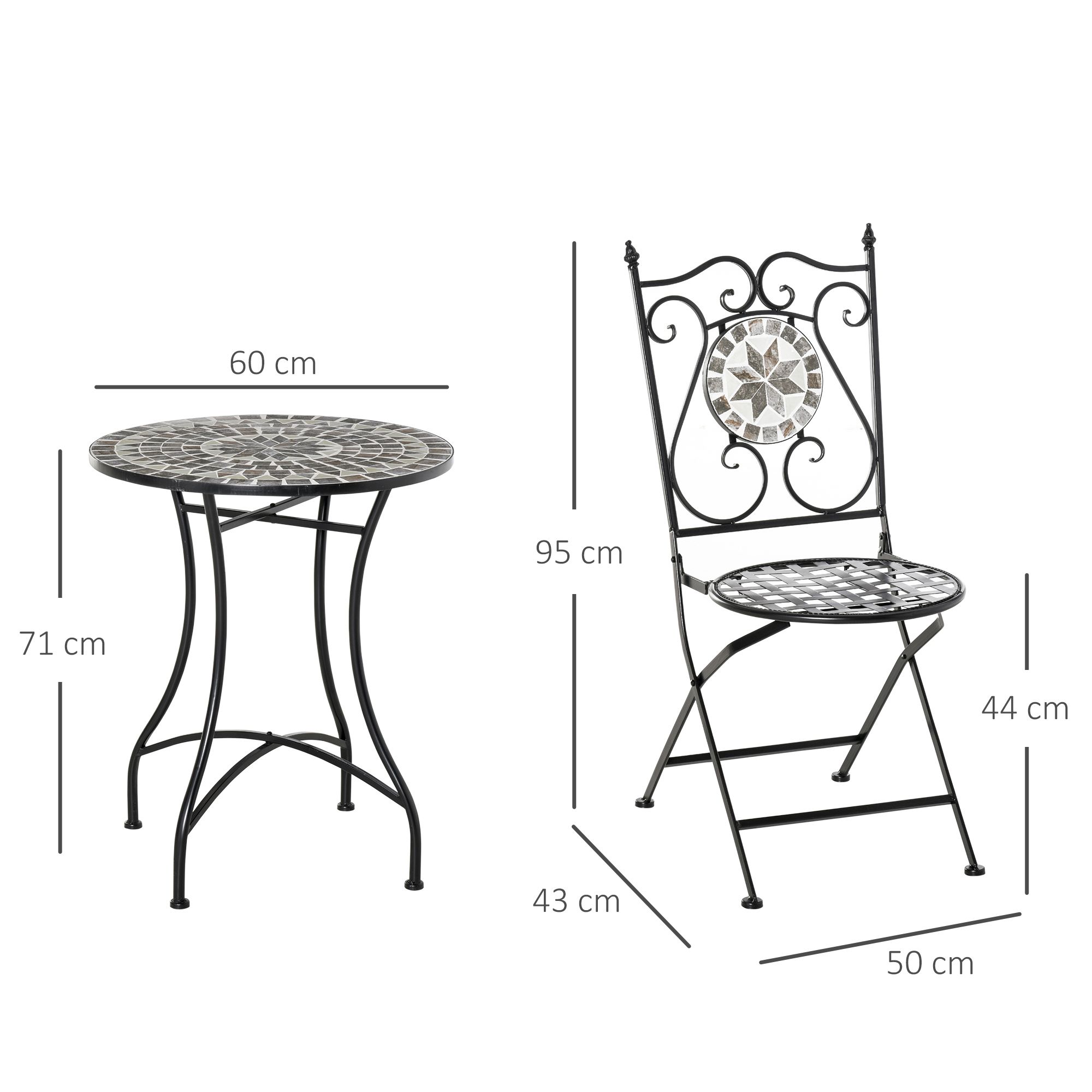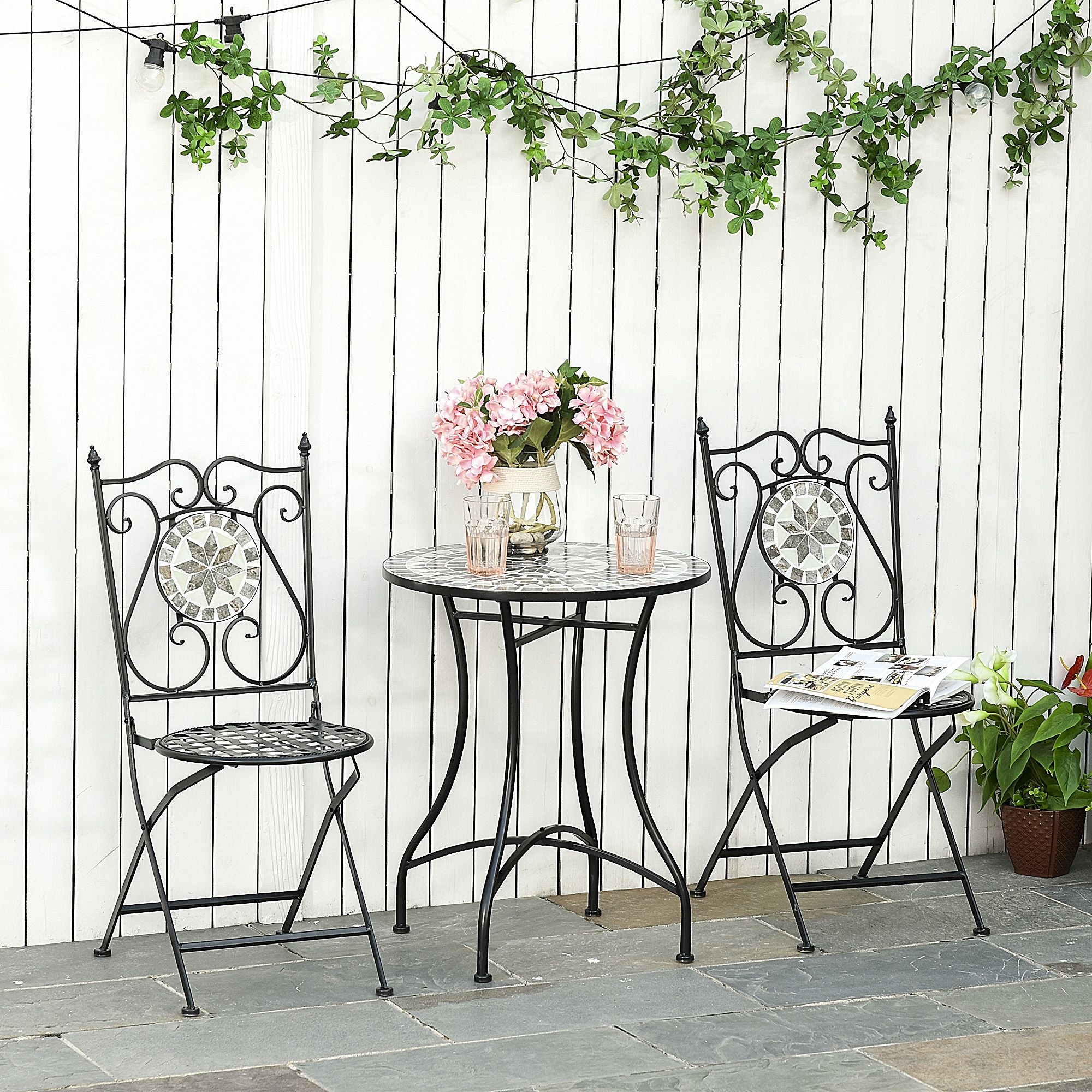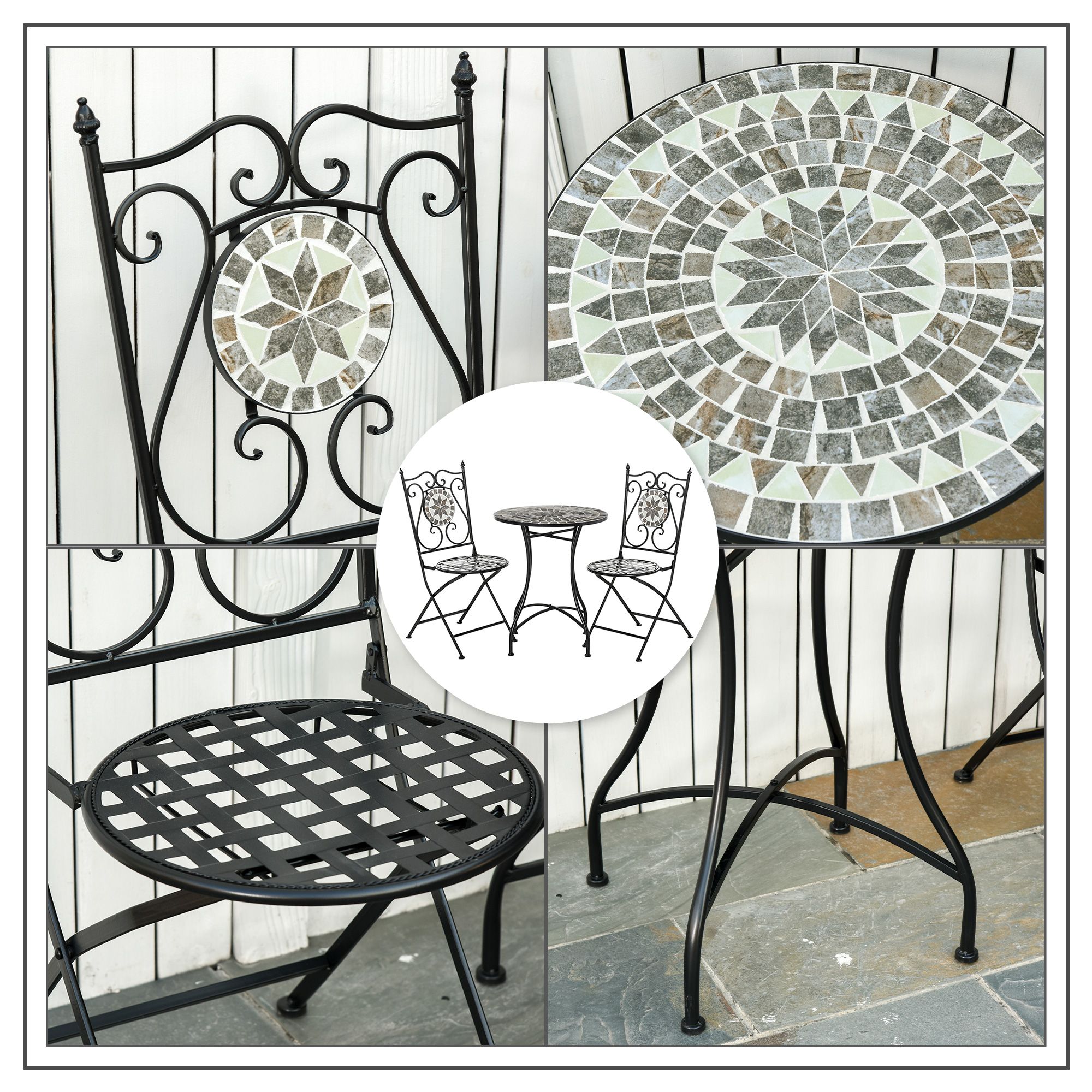 - THREE PIECE BISTRO SET: Includes a small round table and two folding chairs. The small and compact size of the mosaic bistro set is ideal for gardens, balconies, patio areas and other outdoor areas.