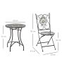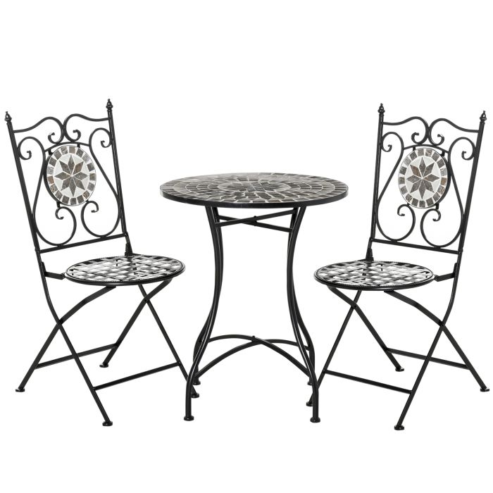 Bring beauty to your everyday with garden bistro set for 2 from. It's formed of a round table with ceramic mosaic tile top and two chairs - both with a mosaic back panel - giving room to relax outdoors with someone else. Made from metal, create a solid and sturdy core structure, with the scrolling on the balcony furniture adding extra elegance to the design. Cut-out grid design on seats prevent water build up. And the garden bistro sets are finished with small round feet on all pieces.