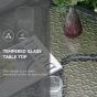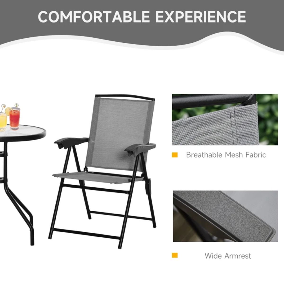 The 3-piece outdoor garden patio furniture set includes a tempered glass-top table and 2 folding chairs. The table base features 4 claw-shaped legs, which makes it sturdy and steady. The folding chair features 4 adjustable backrest positions, which allows you to find the perfect position to relax. It is an ideal way to enjoy a cafe-style experience right outside.