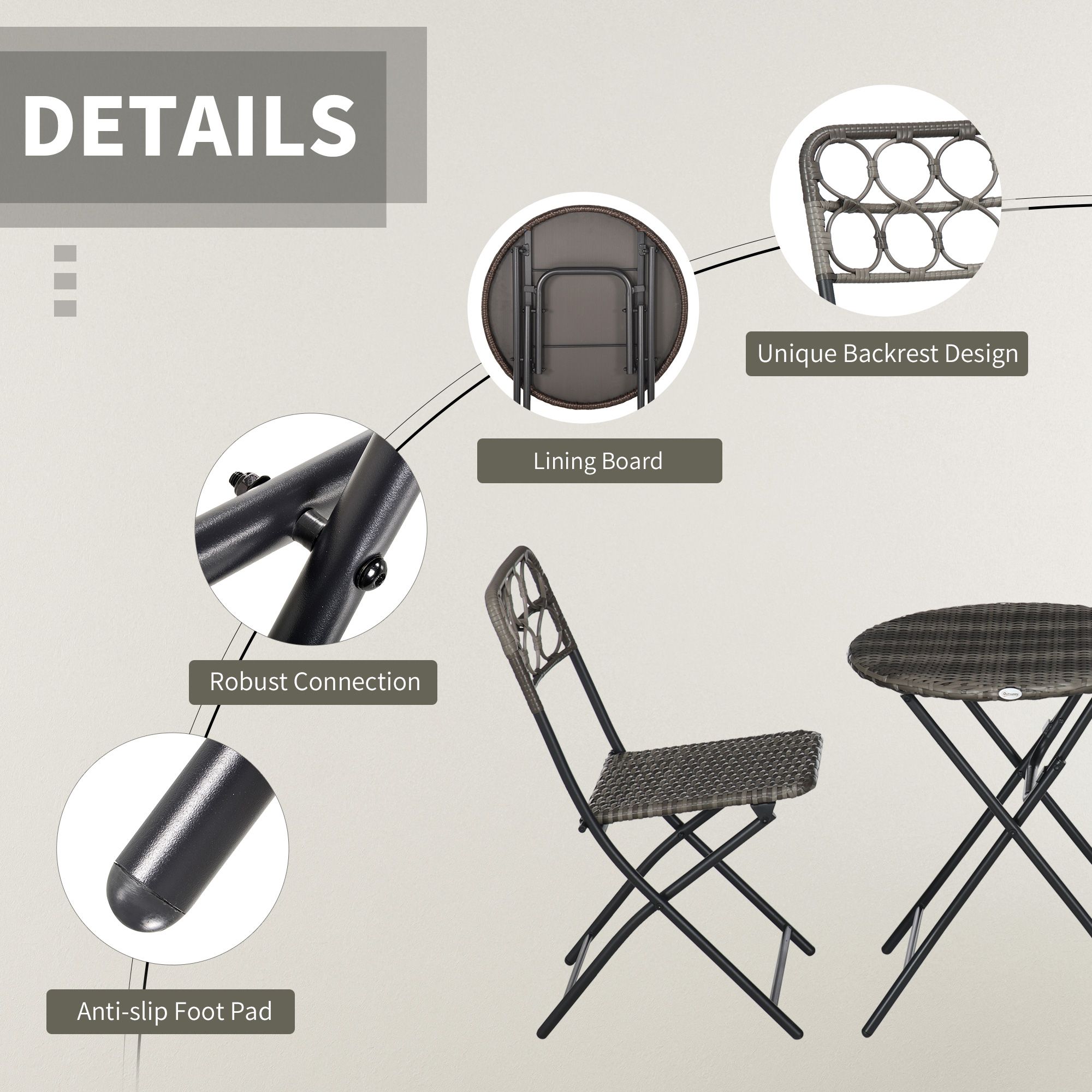 3 PCS Rattan Wicker Bistro Set with Easy Folding, Hand Woven Rattan Coffee Table and Chairs for Outdoor Lawn, Pool, Balcony & Garden, Grey
