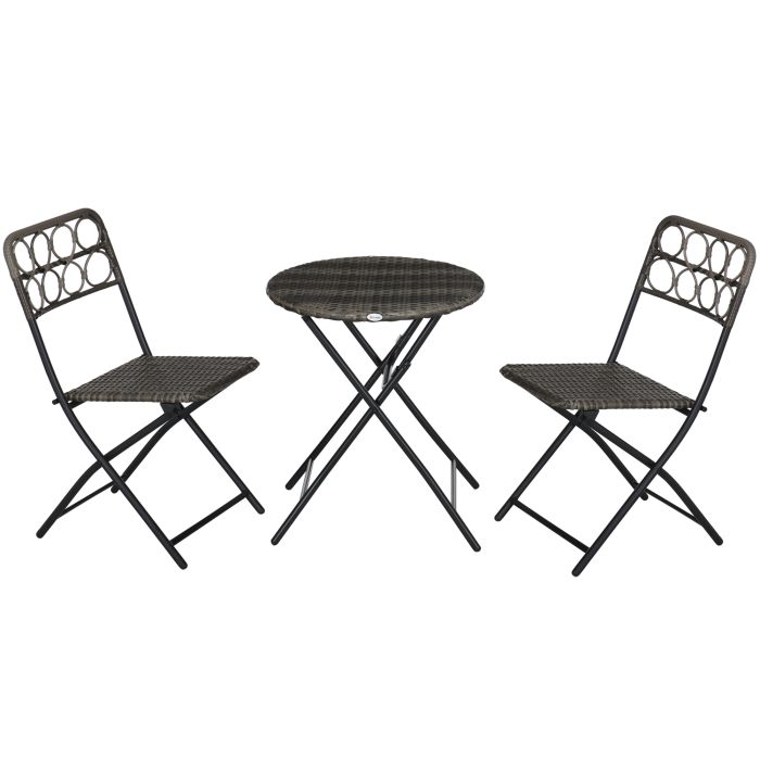 This bistro table set also comes with two chairs: relax with company outdoors. Strong metal frames, with plastic wicker for a beautiful look. All pieces are foldable - carry, move and store easily. A zero-fuss piece made for every outdoor space.