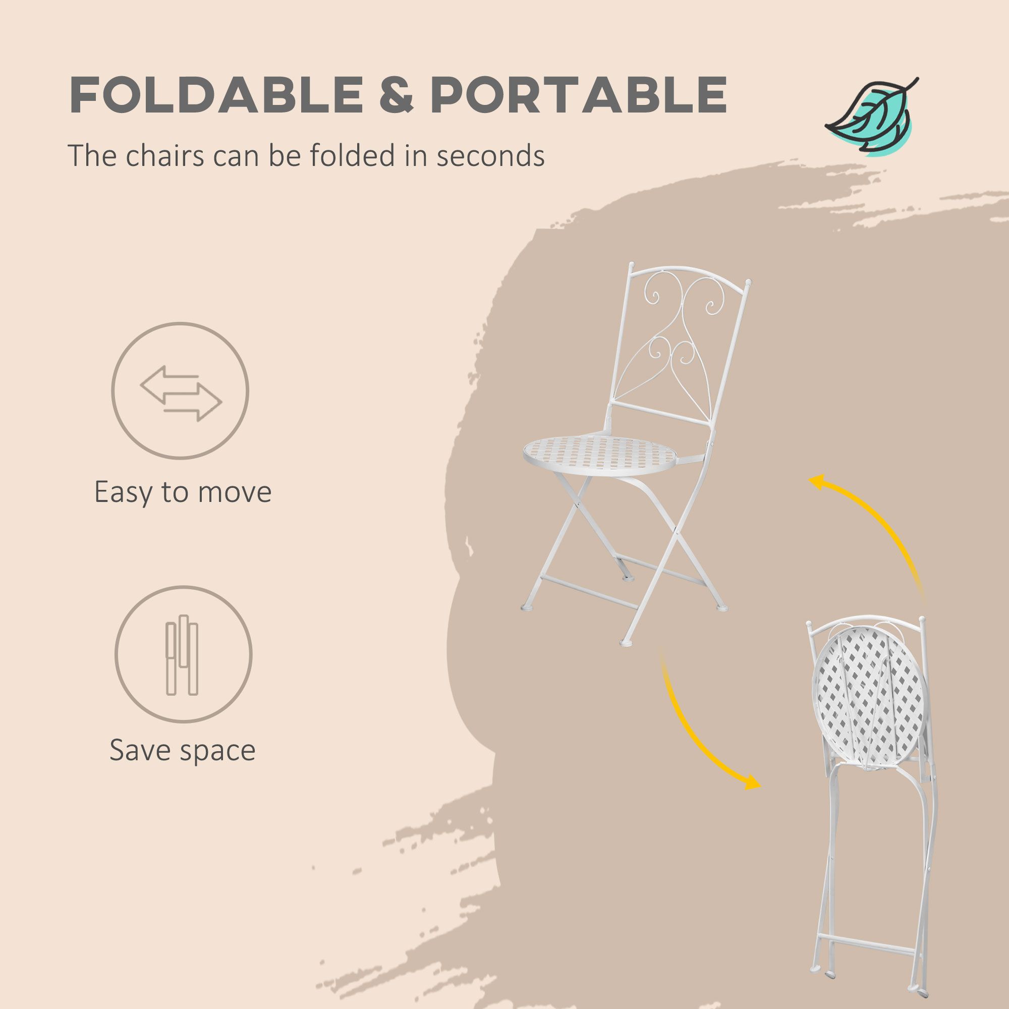 This outdoor bistro set is ready for the seasons ahead. It includes a round side table with engraved scrolled, with pairs with the scrolling on the chair backs - pretty and elegant. All pieces are made from metal, so they're strong and durable and will support you when being used. Both the chairs and table are foldable - so when you're done, you can carry and store them easily. A great way to enjoy the sunshine with company.